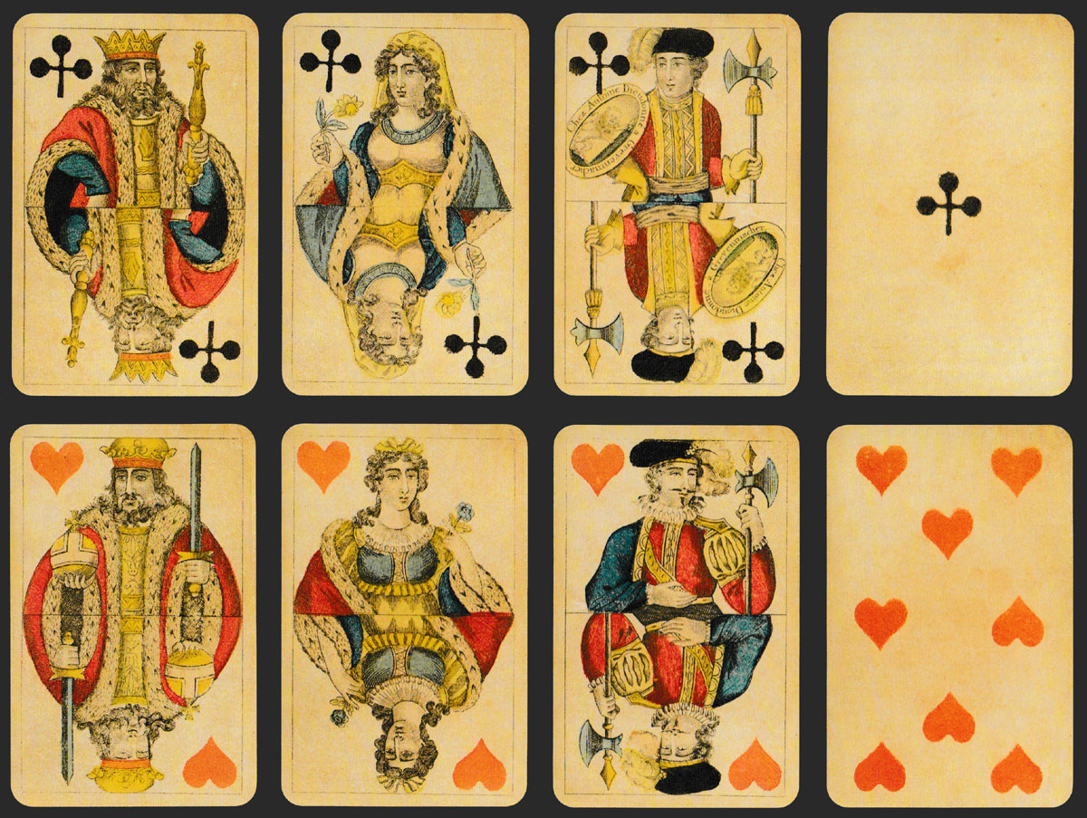 The cards were printed from copper plates, with the red suit symbols being applied later by stencil....