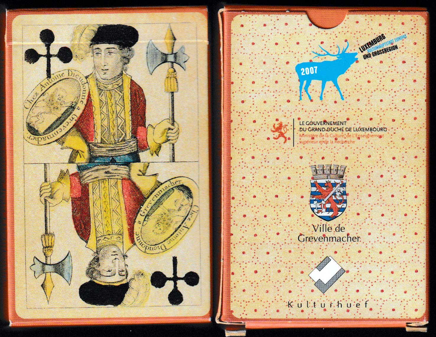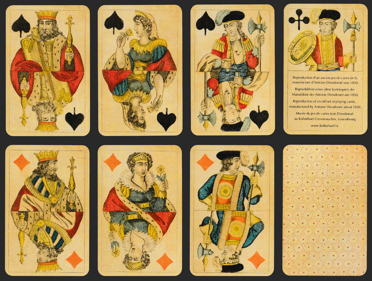 Above: reproduction of a pack by Antoine Dieudonné, Grevenmacher, Luxembourg, c1850. Printed by Cartamundi, Turnhout, Belgium, for Kulturhuef, Grevenmacher, Luxembourg, 2007. 52 cards + 1 extra card in tuck box. Size: 56 x 87 mm.