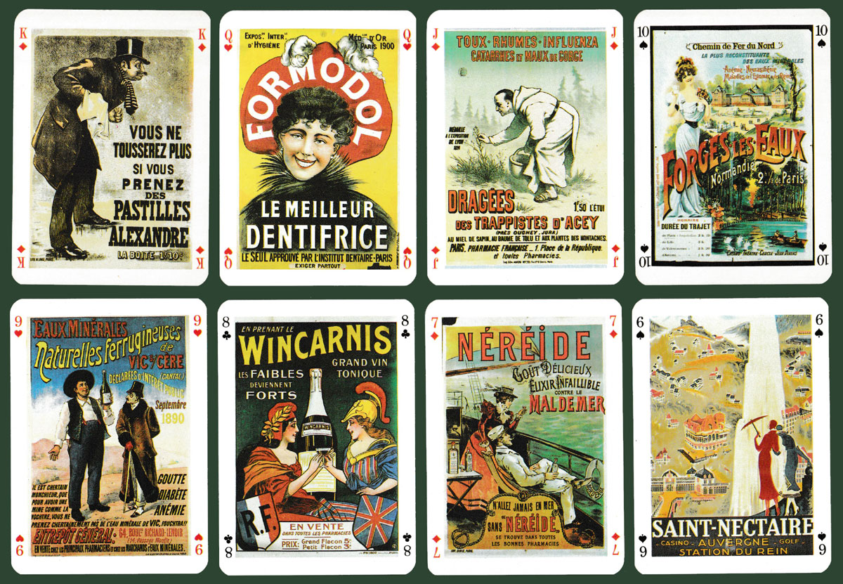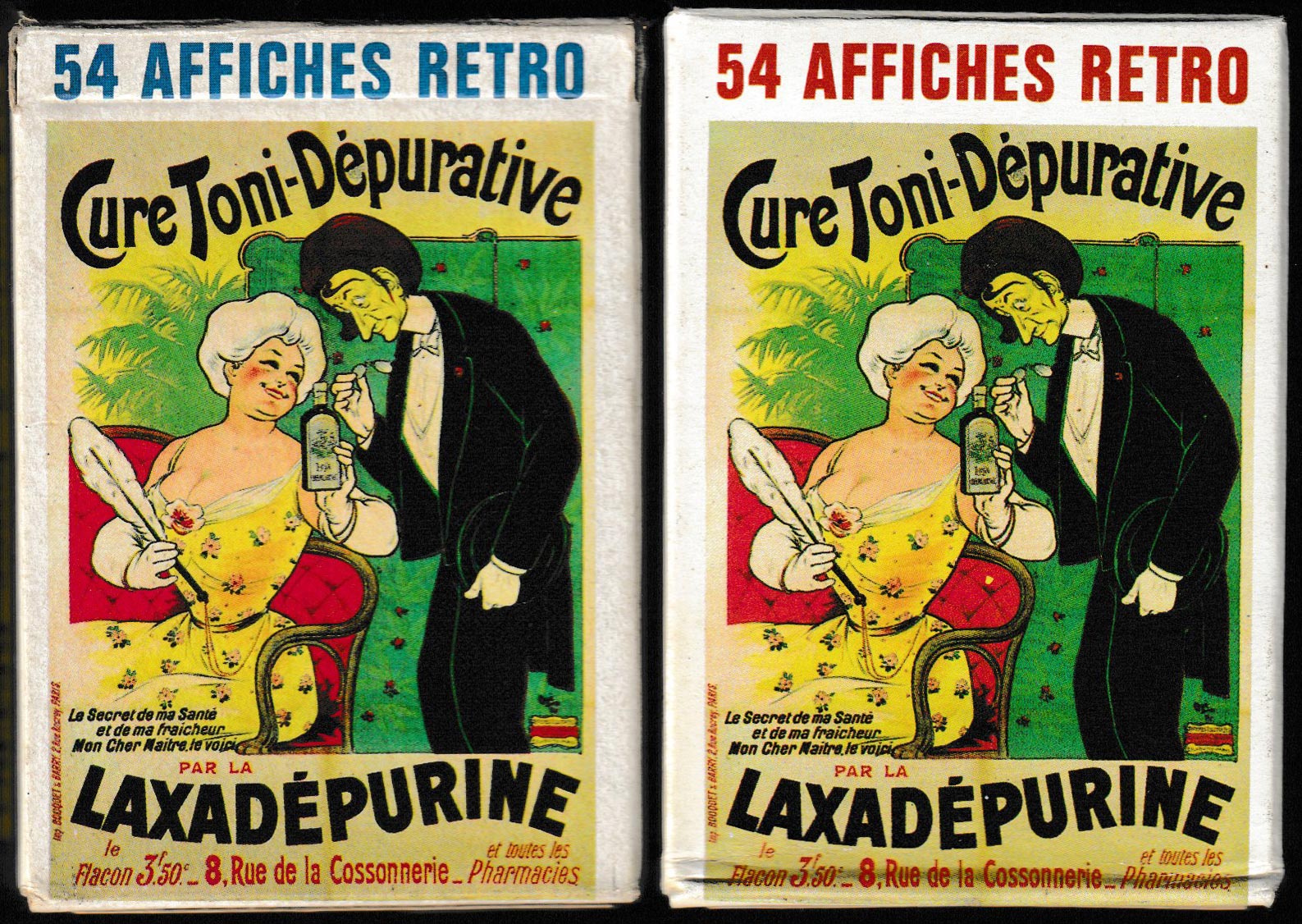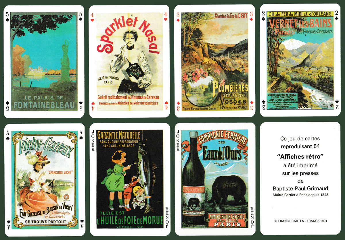 Above: 54 Affiches Retro playing cards printed and published by France Cartes, Saint-Max, France, 1991. 52 cards + 2 Jokers + 1 title card in tuck box. Size: 63 x 88 mm.