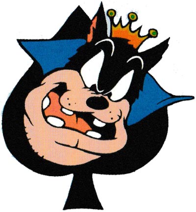 All the most well-known Disney characters – Mickey Mouse, Minnie, Donald Duck, Goofy, etc. – can be found on the courts, Aces and Jokers in this pack, though they are unnamed. The court cards are double-ended, unlike the Aces and Jokers. On each of the Aces, a head of a different character has been superimposed on an enlarged suit-sign. French indices – R, D, V, 1 – in two corners. Pale blue backgrounds and strong black frame lines used throughout. See the box►