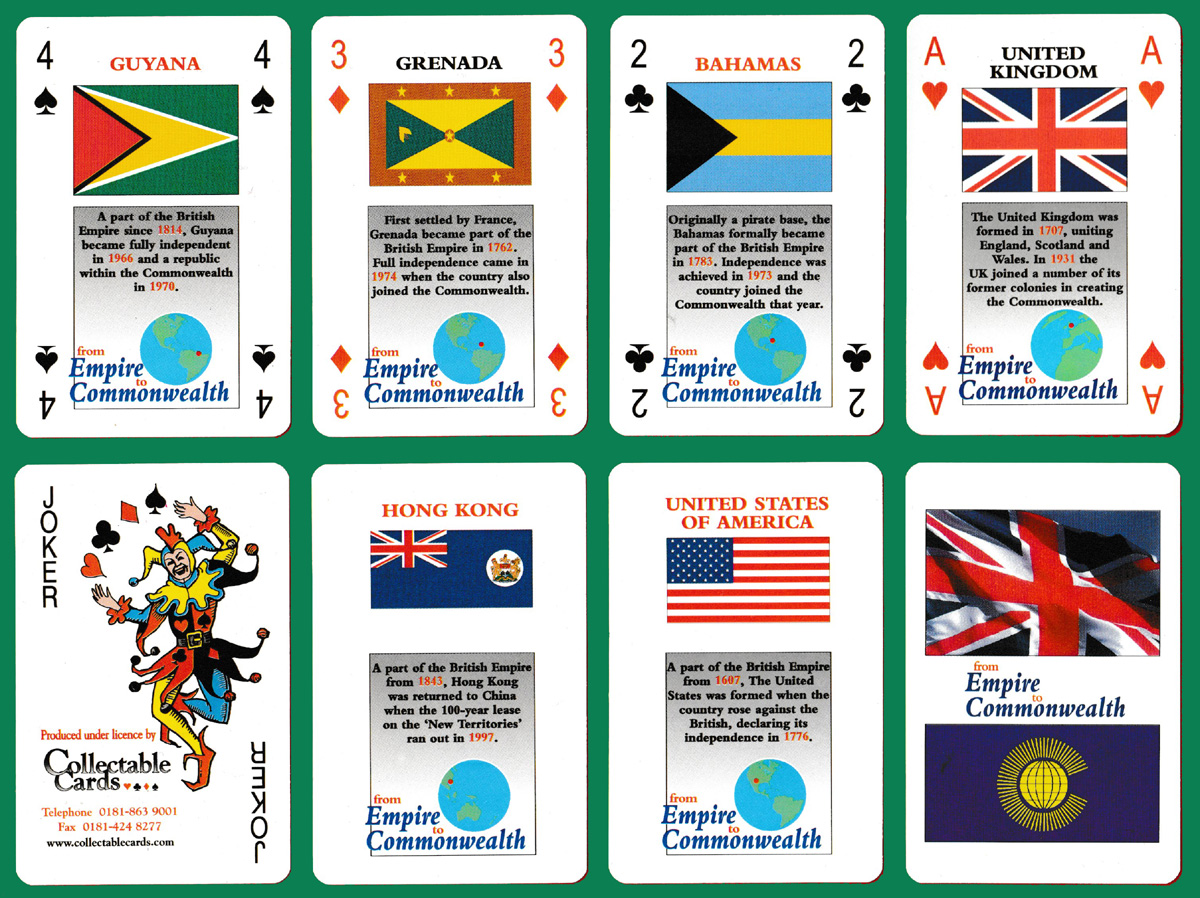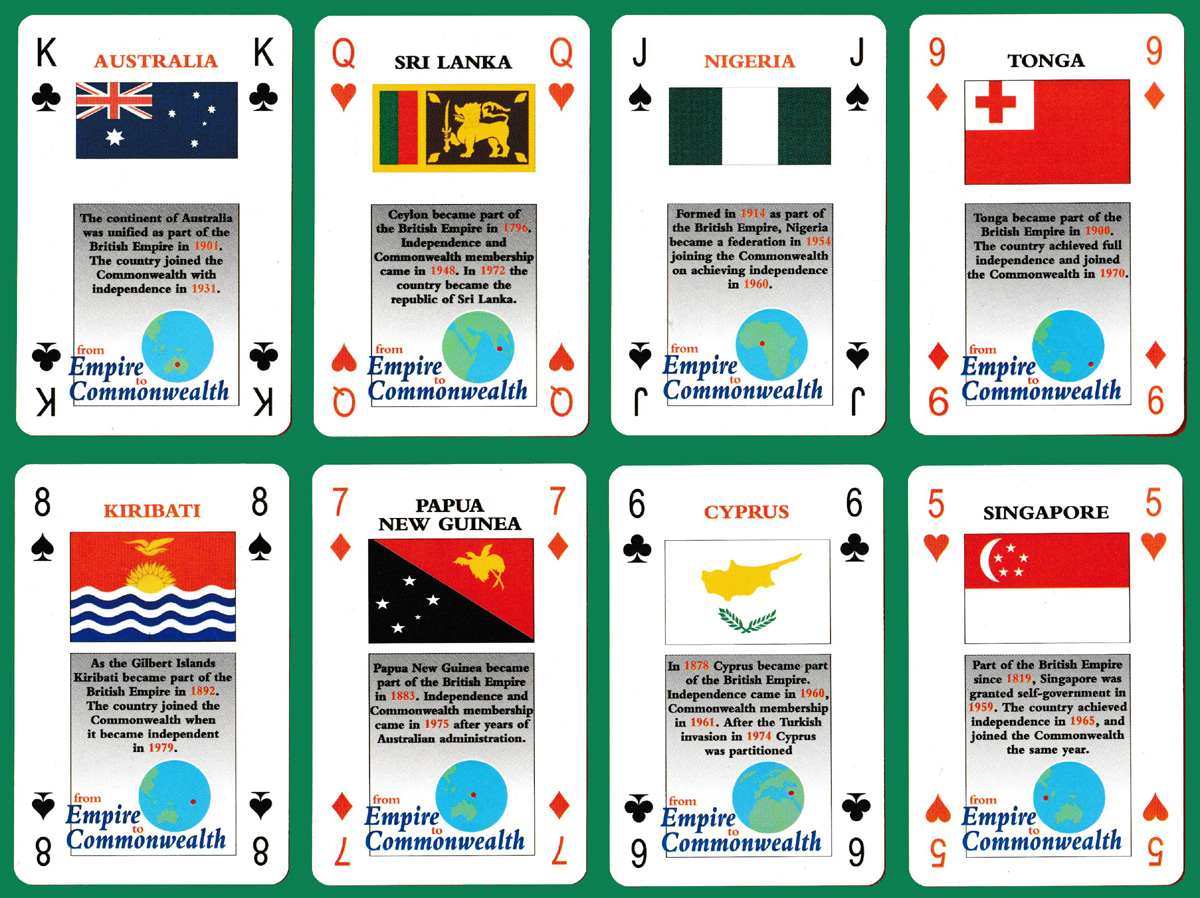 Each card shows the flag of a Commonwealth country, its geographical location on the globe and the dates when that country became first part of the British Empire and then a member of the Commonwealth. The names of the countries appear in red on the black suits and black on the red suits. The two extra cards cover countries (Hong Kong and USA) once part of the British Empire or Commonwealth. The Union Flag (or Union Jack) and the Commonwealth logo make up most of the back design.