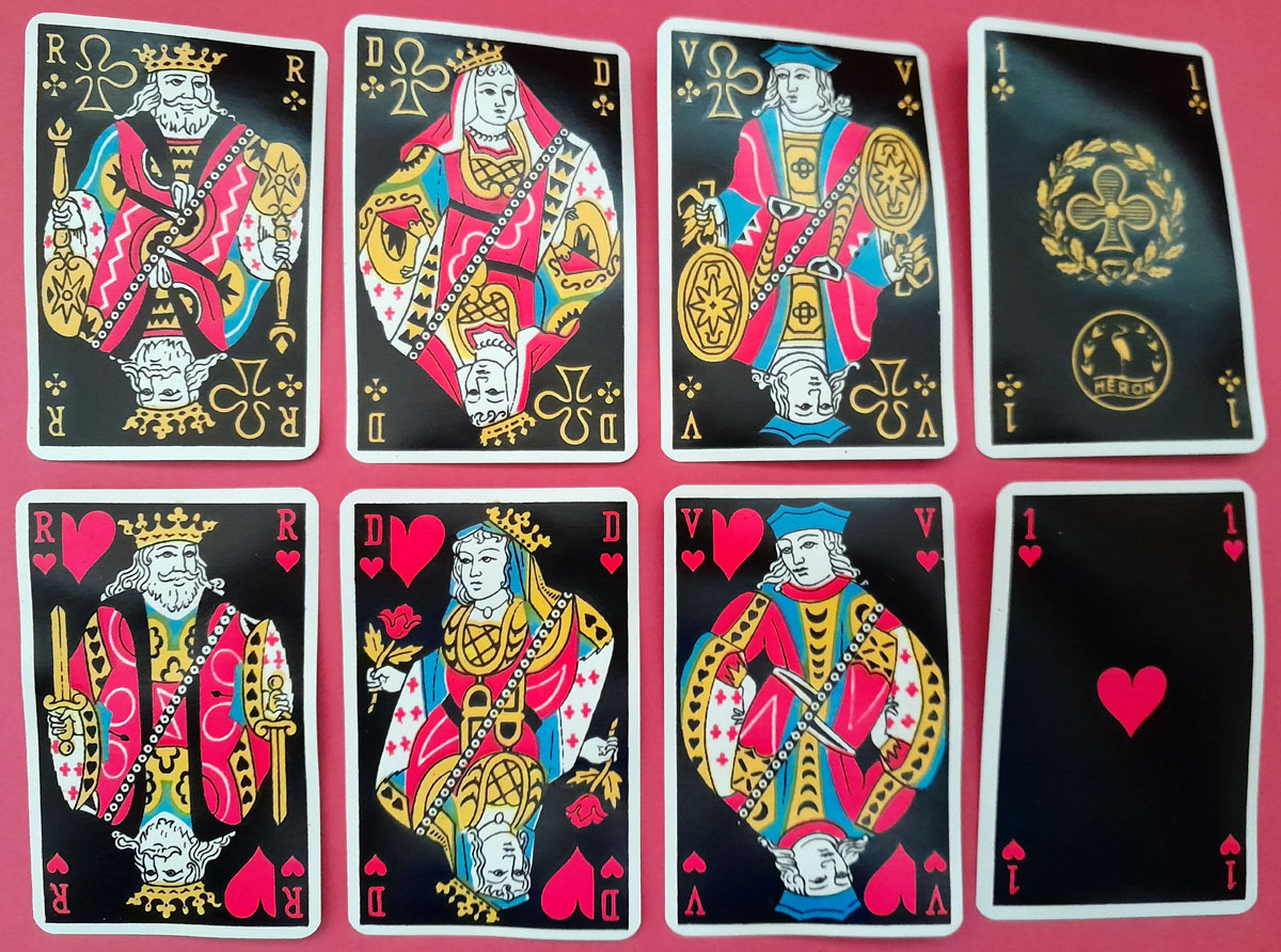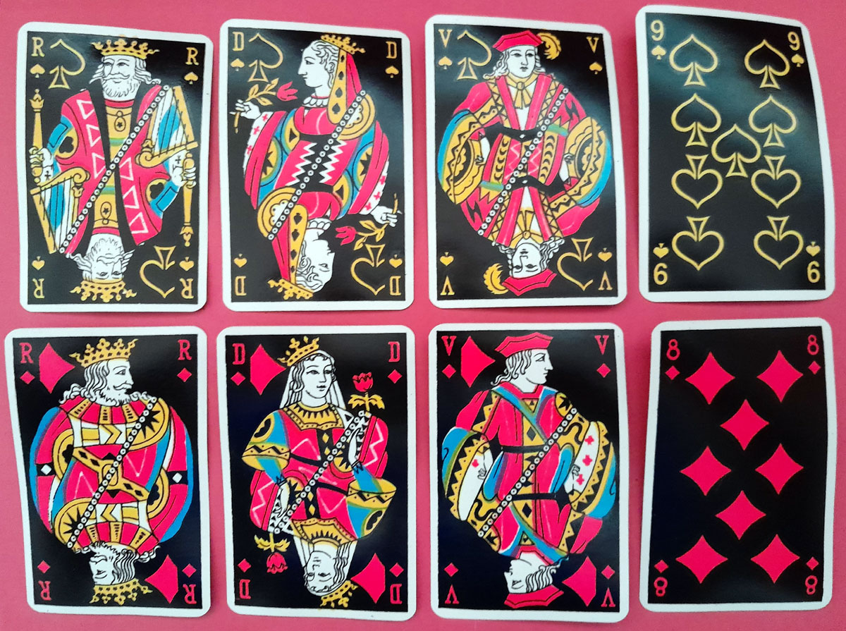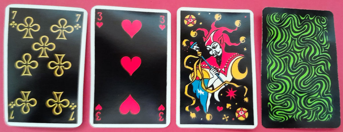 These standard French designs with their fluorescent colours are both fun and garish. As all the backgrounds are black, the black suits are outlined in yellow, while the fluorescent red is closer to pink. The back design is a pattern of wavy green lines against a black background.