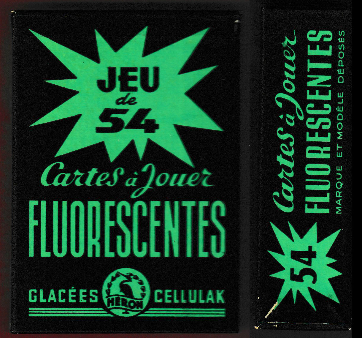 Above: Cartes à Jouer Fluorescentes made by Boéchat Frères (‘Héron’), Bordeaux, France, c1960. 52 cards + 2 (identical) Jokers in upright telescopic box. Size: 57 x 87 mm.