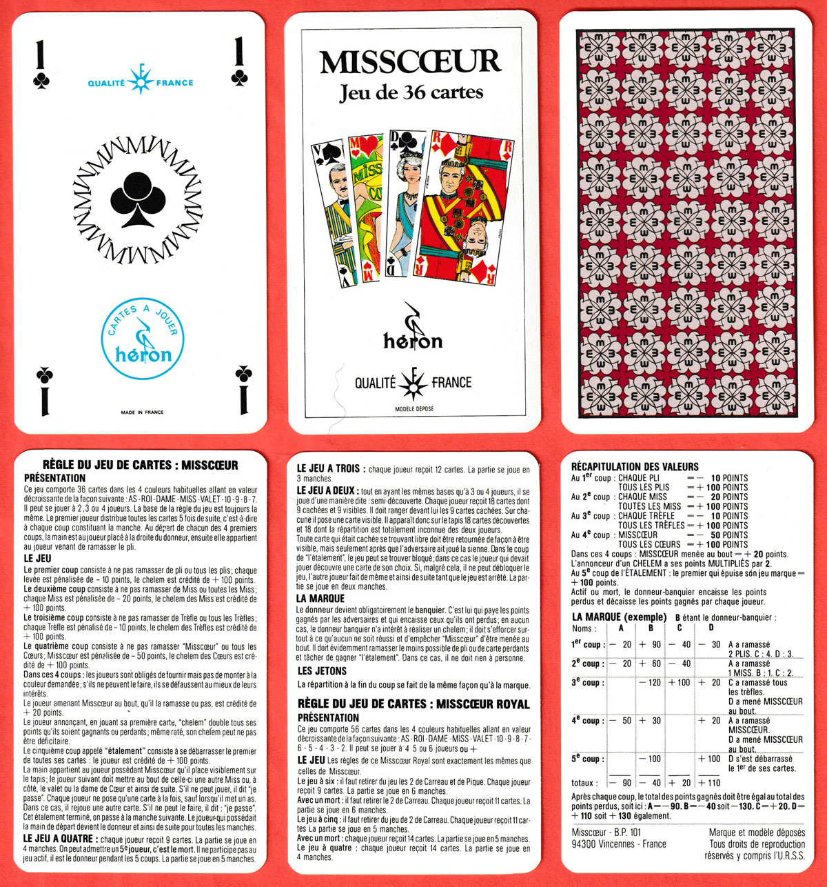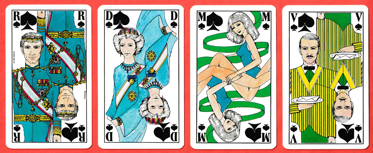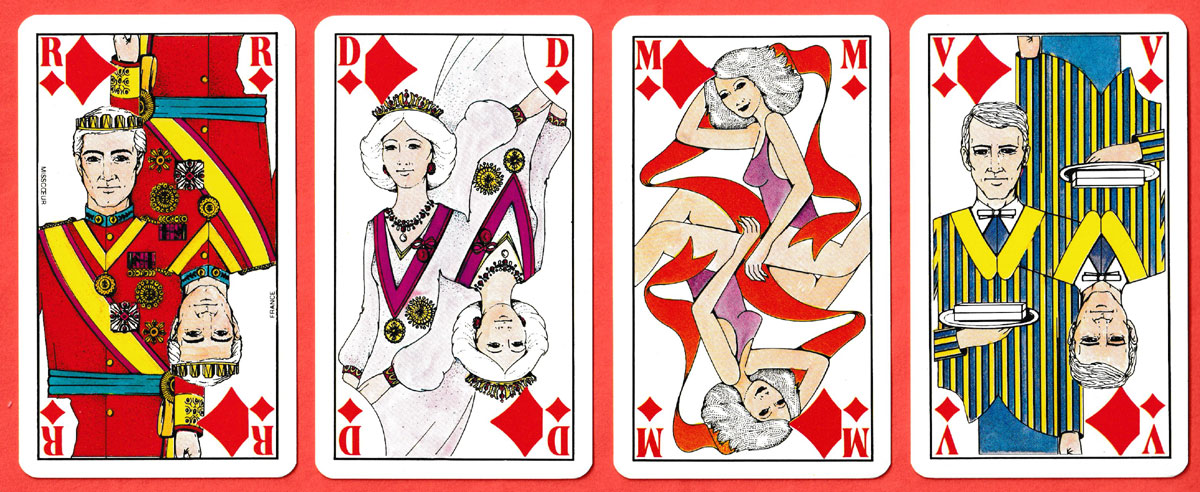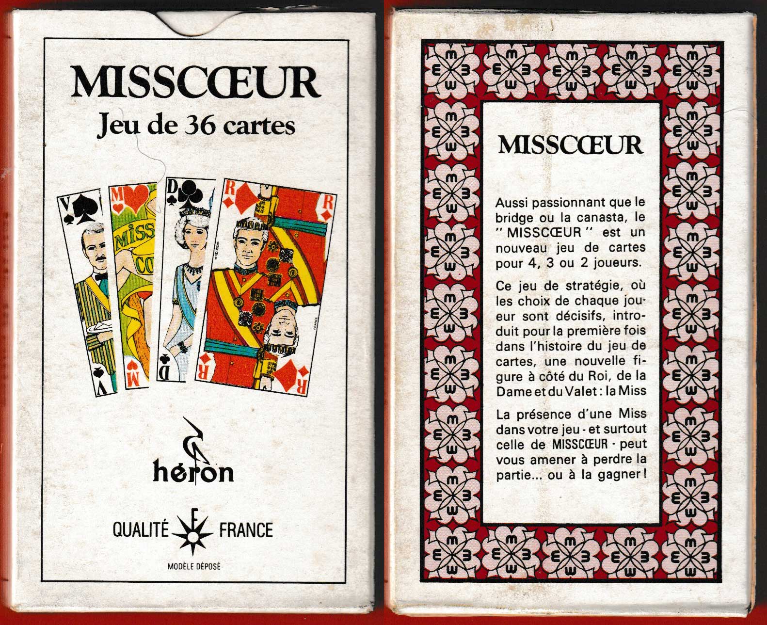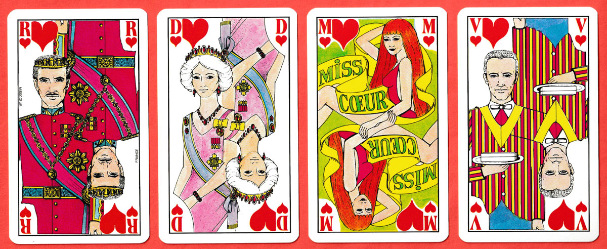 Above: ‘Misscœur’ playing cards published by Misscœur, Vincennes, France, c1980. Printed by Héron, Bordeaux, France. 36 cards + 1 title card + 3 extra cards with rules in French for two card games, in tuck box. Size: 61.5 x 102 mm.