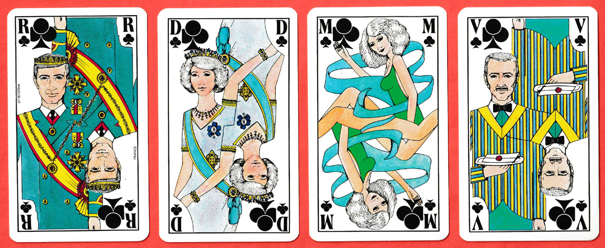 Alongside the three regular court cards, a ‘Miss’ has been added to each suit in this pack of elongated cards – a ‘first’ according to the publishers. The four court cards in each suit are all non-standard, fully filling the available space. They have something of a photofit feel to them, with different outfits and a slightly different set of colours for each suit. The Jacks are butlers or footmen. “MISSCŒUR / FRANCE” appears on each of the Kings. The pips on the Clubs suit have been given a new look. The rules for two special card games are presented (in French) on the three extra cards. See the box►