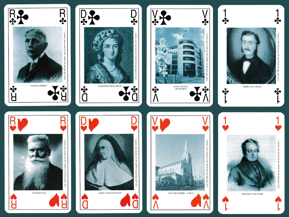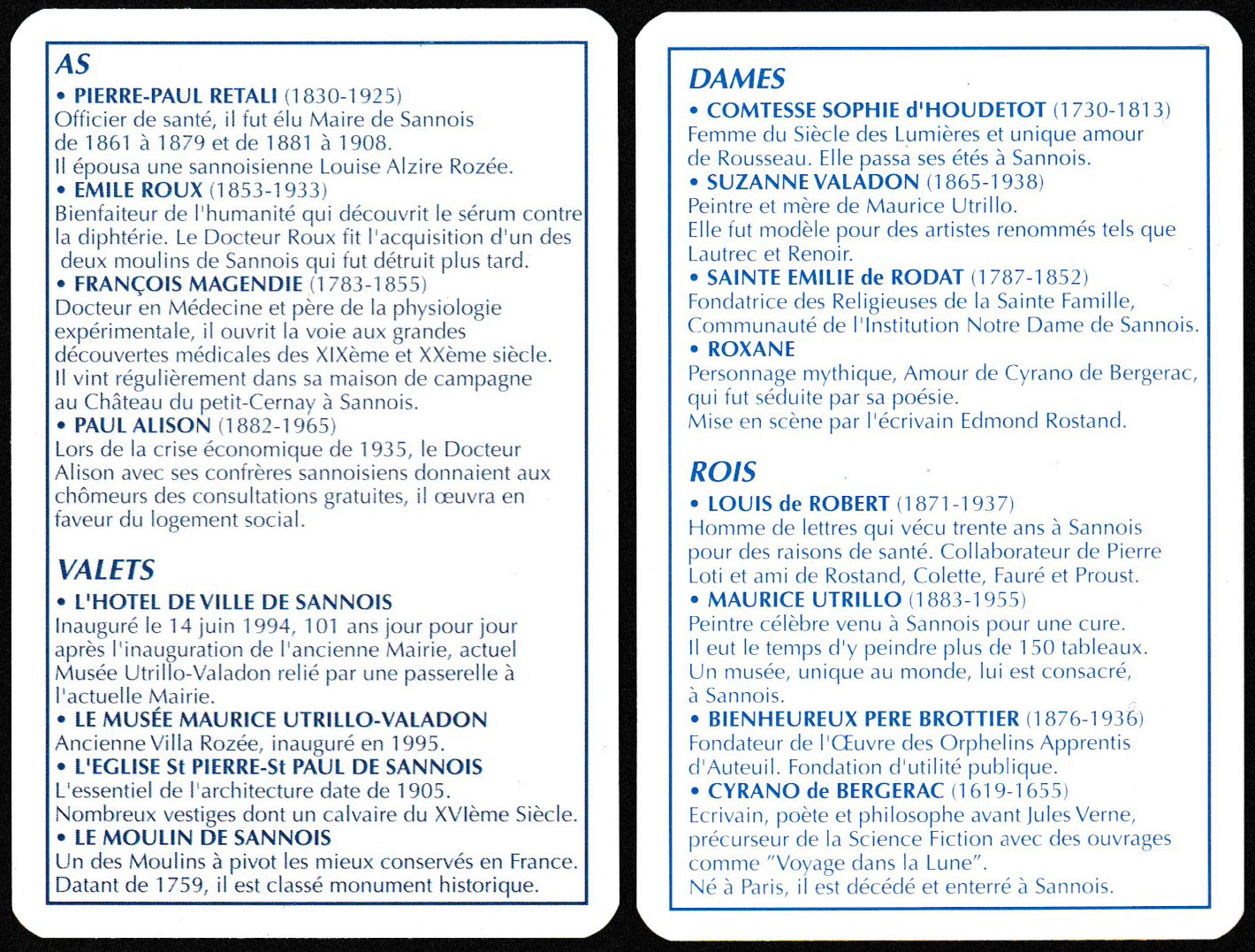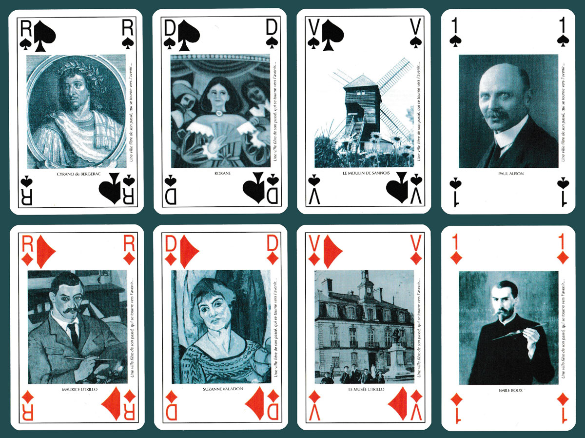 Sannois may well not be somewhere that many people have heard of outside France but it is clearly proud of its heritage. It is in fact a commune located 15.2 km from the centre of Paris. Famous men and women associated with the commune appear on the kings, queens and aces, while notable local buildings can be found on the jacks. The most famous of the celebrities are Maurice Utrillo, the painter, and Cyrano de Bergerac, the novelist and playwright. All are listed with brief descriptions in French on the double-sided extra card . A monochrome colour scheme (grey-blue) has been used throughout. On all of the court cards and aces one can read “Une ville fière de son passé, qui se tourne vers l’avenir…” (“A town proud of its past, which is turning towards the future…”). This is an appropriate motto for a town at the turn of the millennium. The millennium is actually only mentioned on the reverse and on the box (“an 2000”) but collectors of millennium packs might like to consider adding this one to their collections.