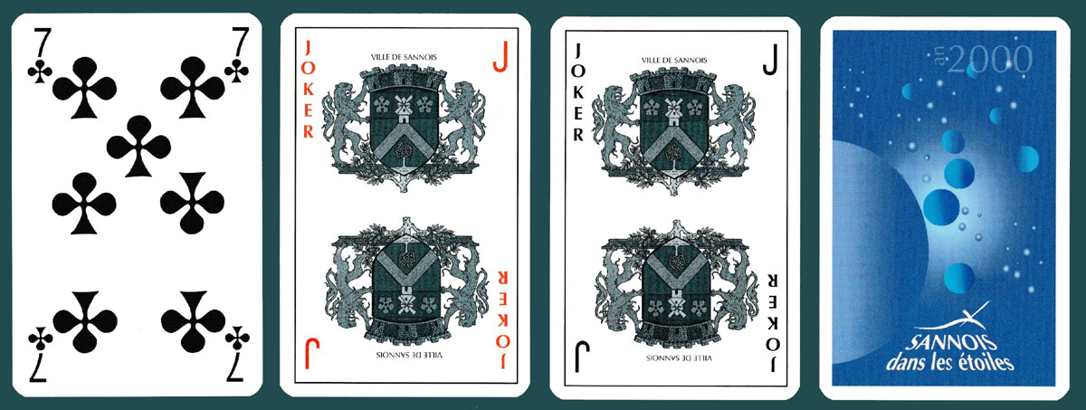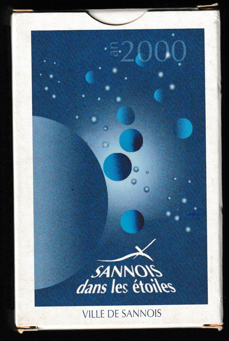Above: Sannois dans les étoiles playing cards made by Héron S.A., Mérignac, France, c2000. 52 cards + 2 Jokers + 1 double-sided extra card in tuck box. Size: 58 x 89 mm. The box design is the same front and back.