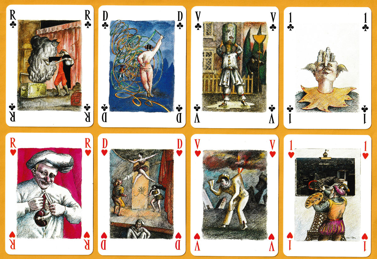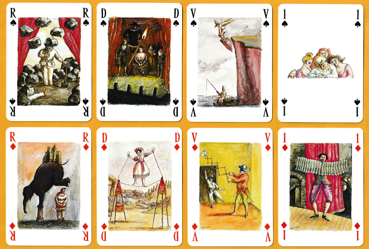 To illustrate their annual report for 1988, the reinsurance company SCOR commissioned the artist Roland Topor (1938-1997) to come up with images reflecting various activities involving risk. The results can be seen on the court cards and aces in this pack where Topor’s black and surrealist humour is evident in the bizarre, fantastical and often absurd images of risky situations. The setting for those situations is frequently the stage, as that was a milieu with which Topor was certainly familiar. Quite a bold commission from a reinsurance company! See the box