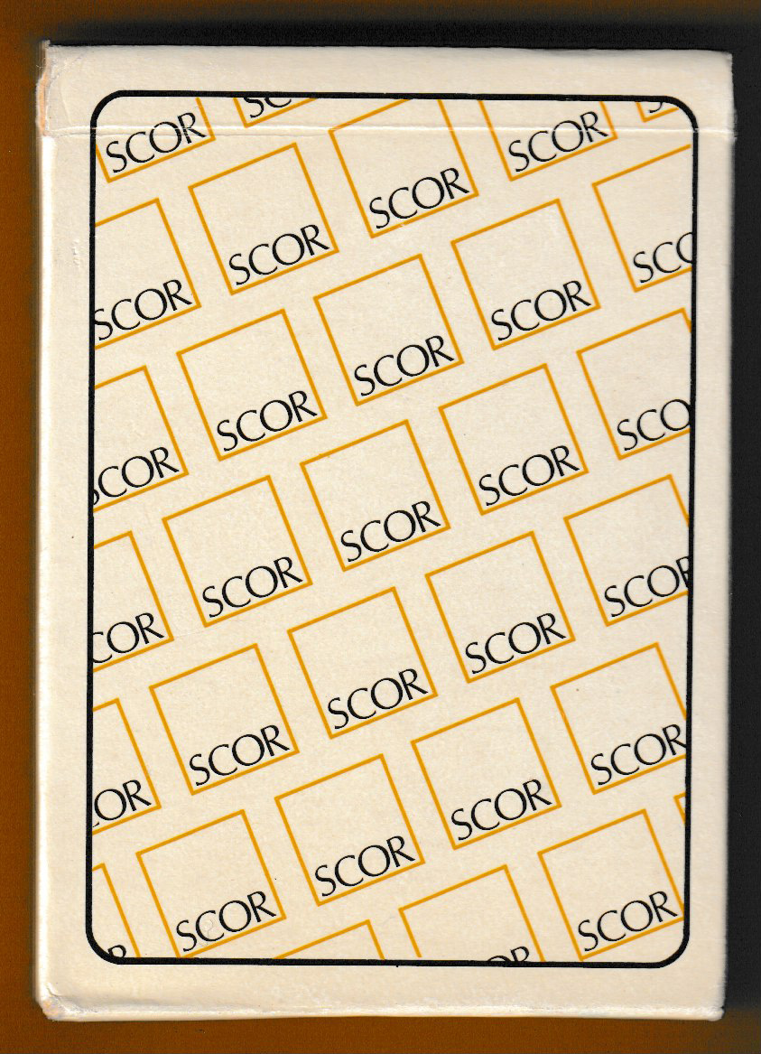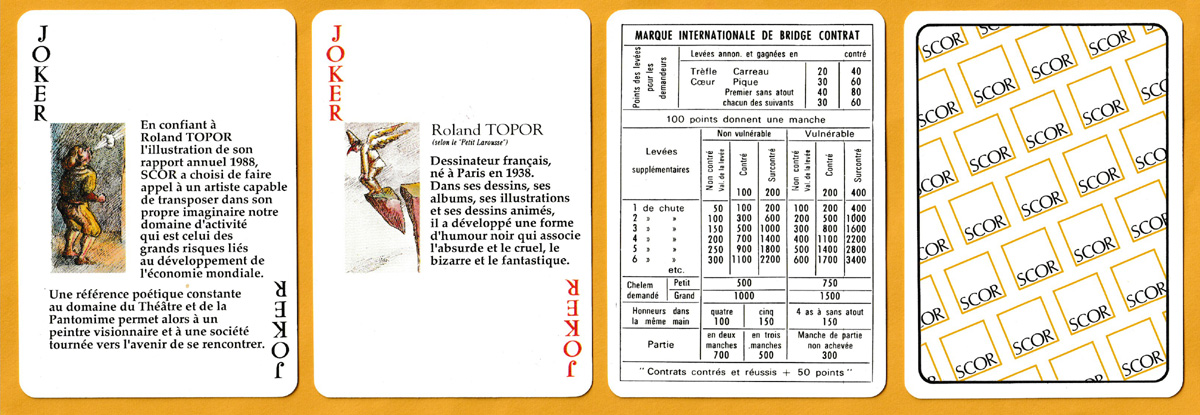 Above: SCOR playing cards designed by Roland Topor, made by Héron S.A. for the SCOR reinsurance company, France, 1988. 52 cards + 2 Jokers + 1 bridge score card in tuck box. Size: 63 x 88 mm.