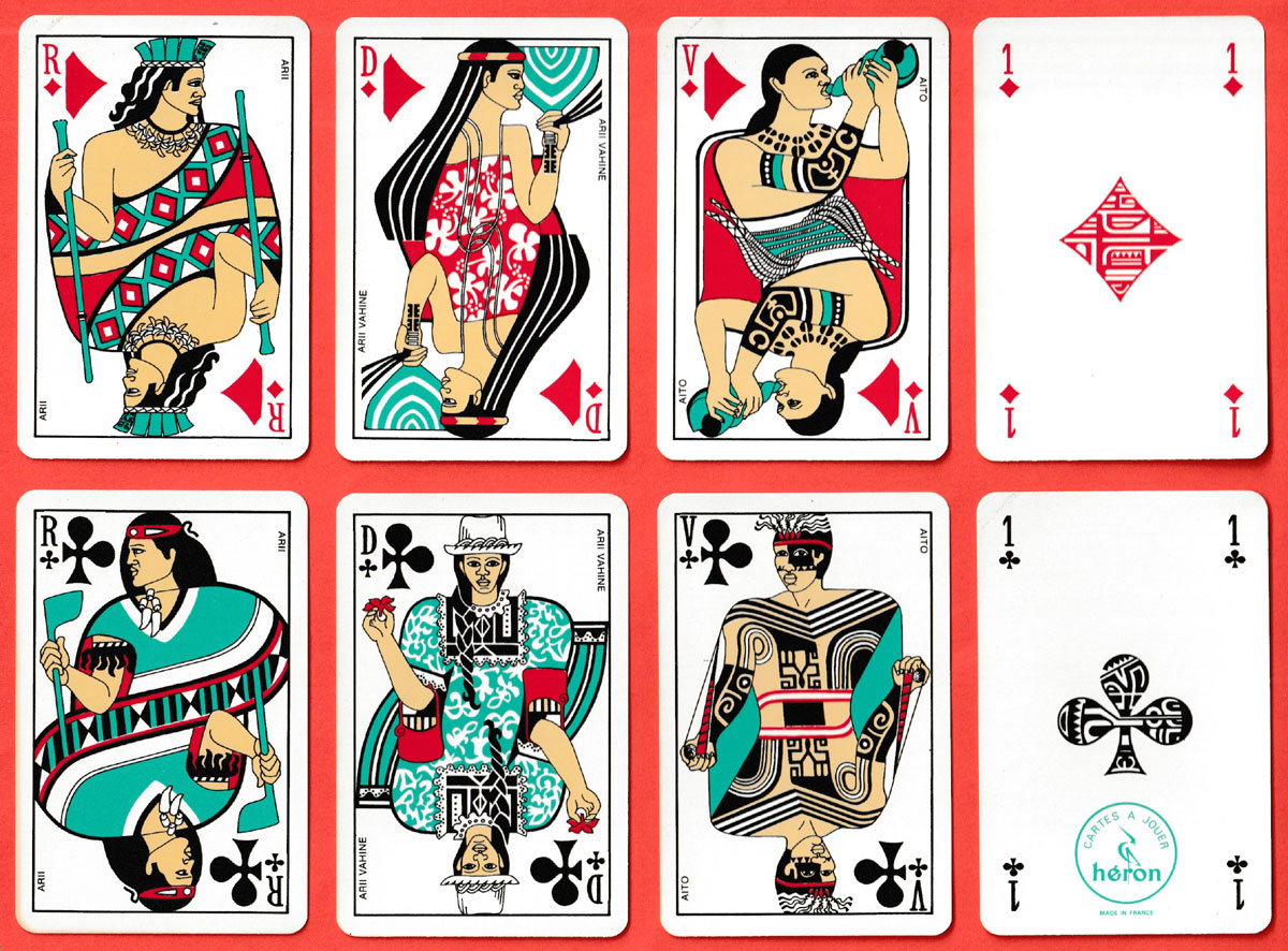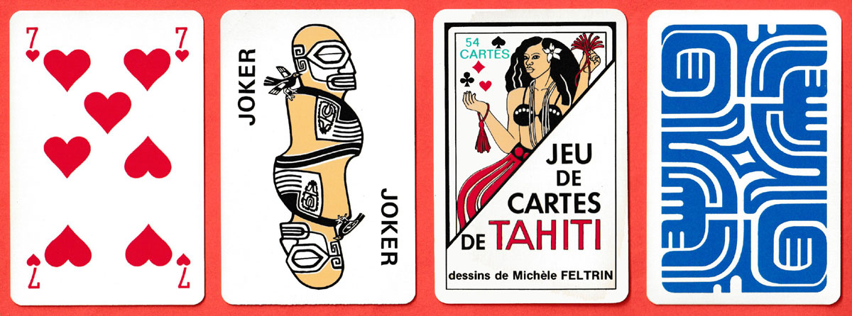 Above: Jeu de Cartes de Tahiti designed by Michèle Feltrin and made by Héron, Bordeaux, France, for Les Editions du Lézard, c1983. 52 cards + 2 (identical) Jokers + 1 title card in clear plastic box. Size: 57 x 87 mm.