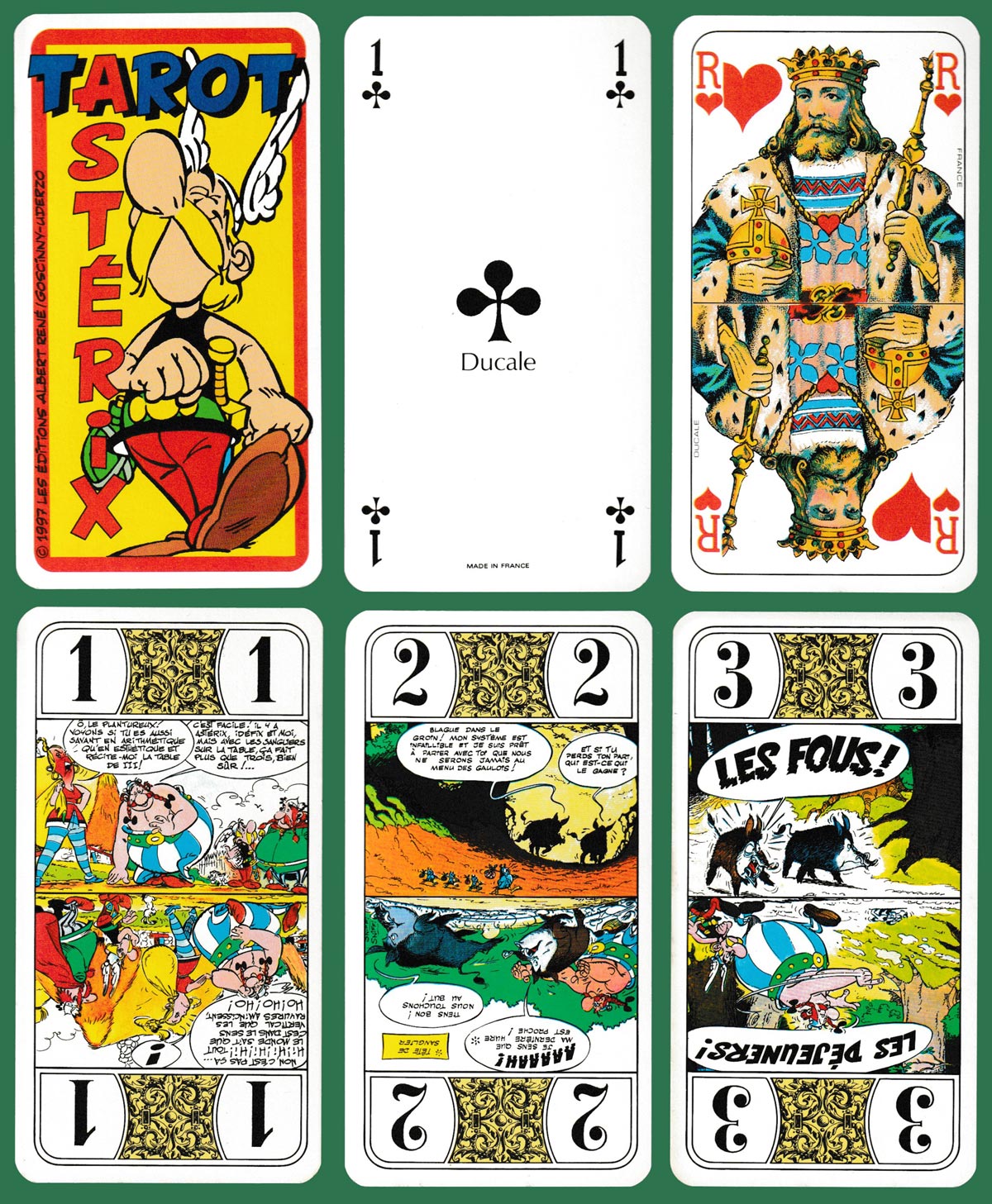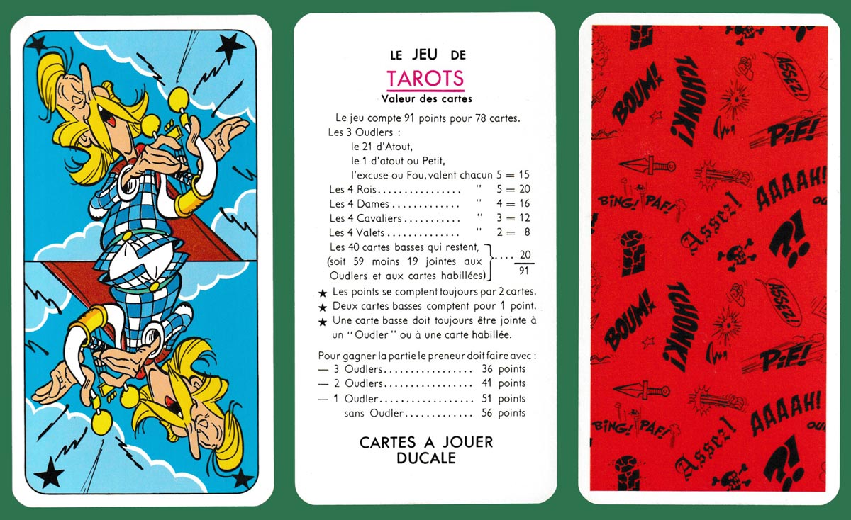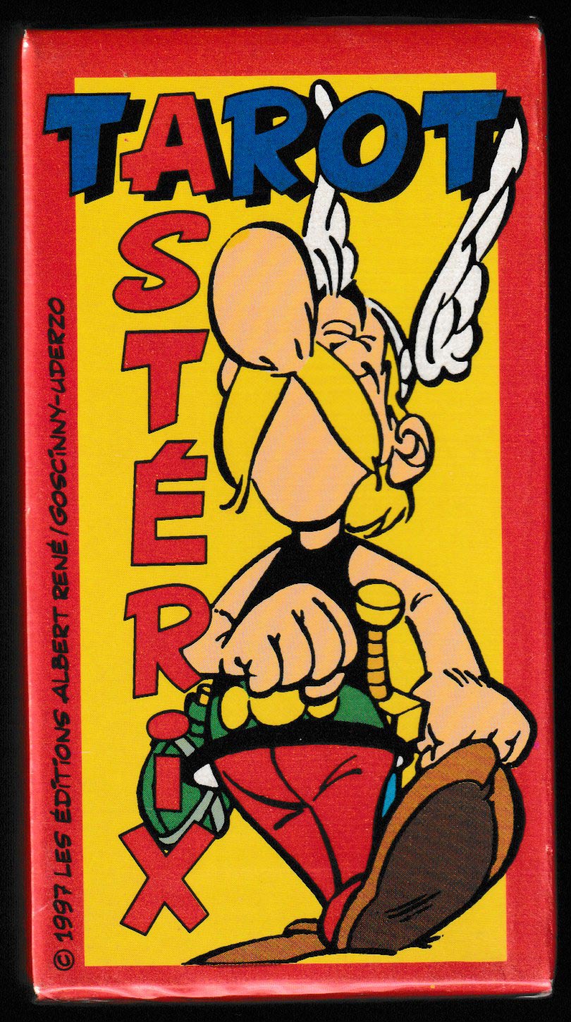 Above: Jeu de Tarot Astérix made and published by France Cartes, Saint-Max, France, 1997. 78 cards + 1 title card + 1 extra card (with card values in the game) + leaflet of rules in French, in tuck box. Size: 60 x 113 mm. © 1997 Les Editions Albert René / Goscinny-Uderzo.