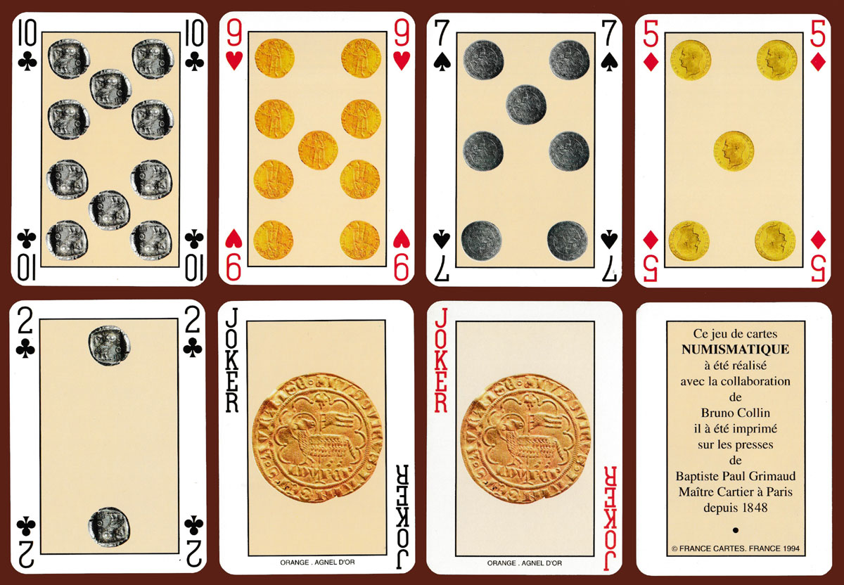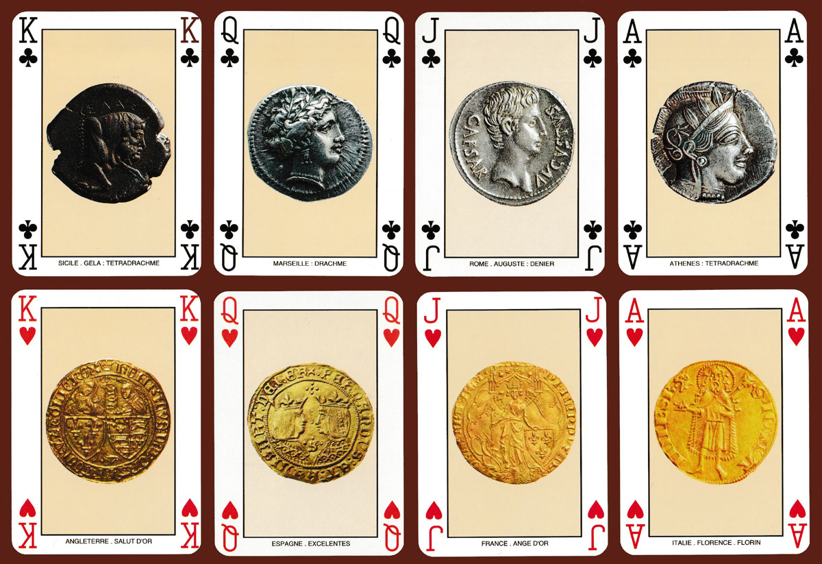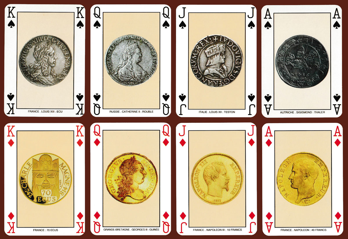 Above: Jeu Numismatique playing cards made and published by France Cartes, Saint-Max, France, 1994. 52 cards + 2 Jokers + 1 title card + leaflet in French and English, in tuck box. Size: 63 x 88 mm. © France Cartes. France 1994