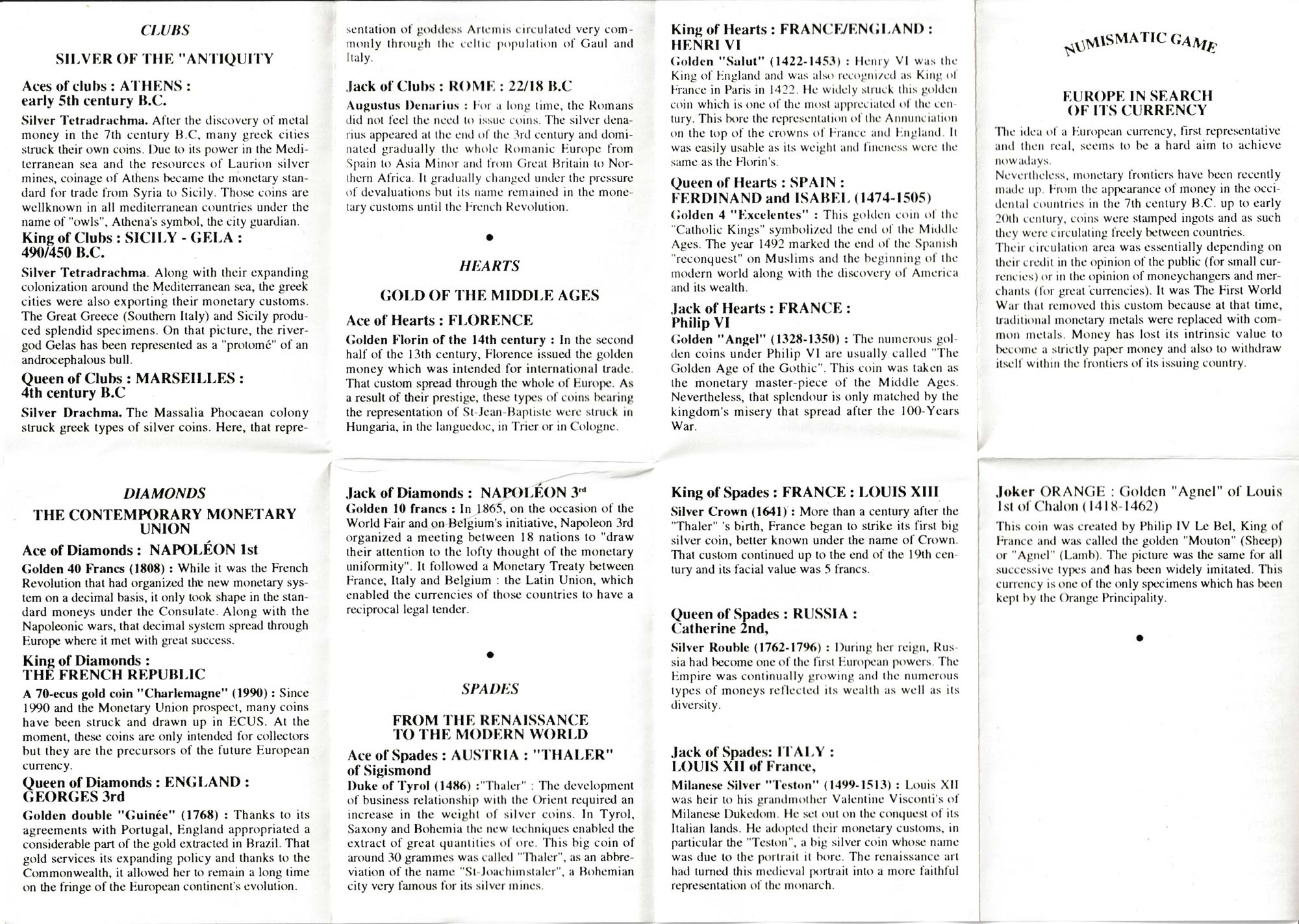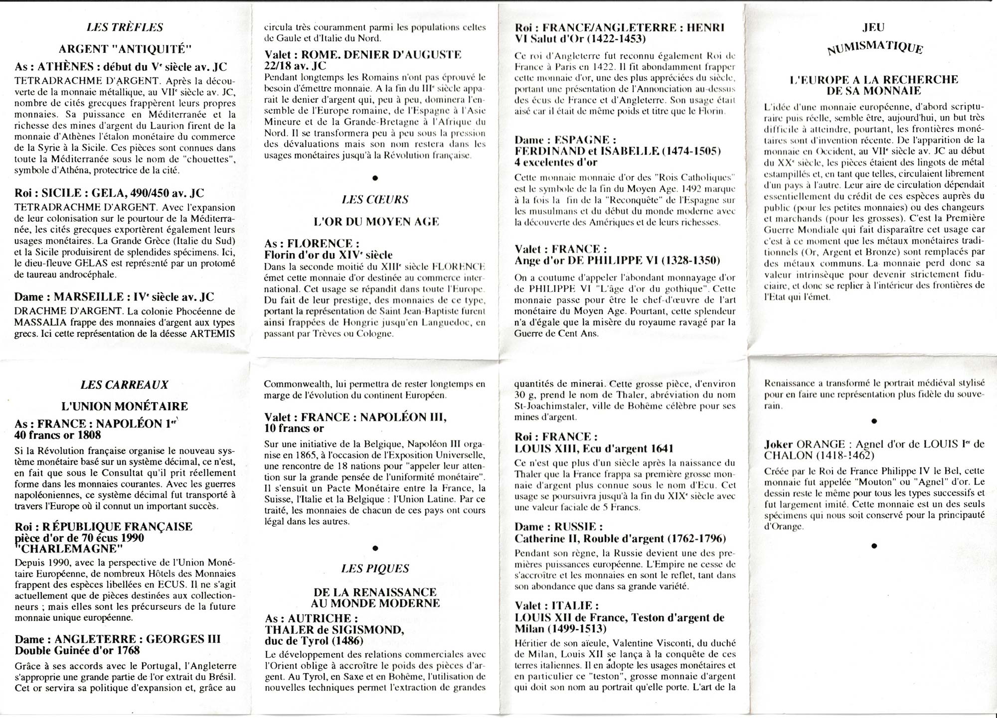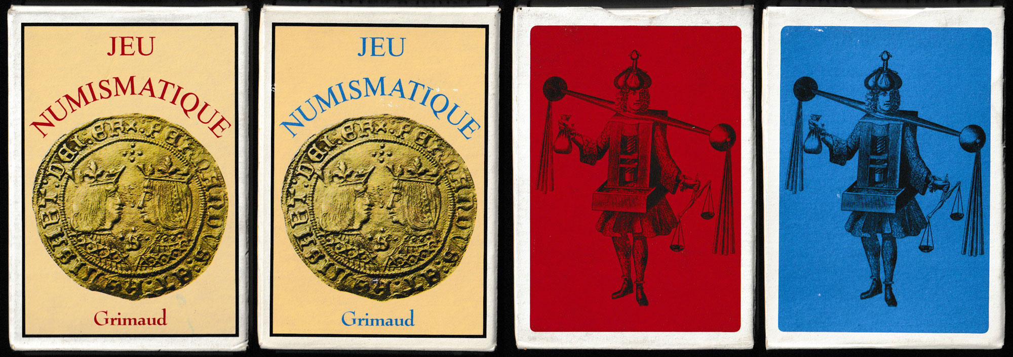 Above: Jeu Numismatique playing cards made and published by France Cartes, Saint-Max, France, 1994. 52 cards + 2 Jokers + 1 title card + leaflet in French and English, in tuck box. Size: 63 x 88 mm. © France Cartes. France 1994