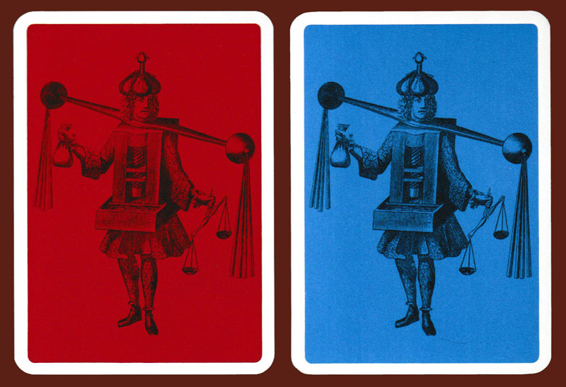In the run-up to the introduction of the euro on 1 January 1999, there was much discussion about which common currency should be adopted across Europe. Illustrated in this pack are some of the forerunners of the euro including the écu. The suits are divided as follows: Clubs – Silver of Antiquity; Hearts – Gold of the Middle Ages; Spades – From the Renaissance to the Modern World; Diamonds – Monetary Union. Each of the court cards, aces and Jokers carries the name of the coin and the country of origin, with further information about each in the accompanying leaflet in French and English. On the numeral cards, the pips have been replaced by smaller versions of the coins which appear on the aces (except for the suit of Clubs). “Le Monnoyeur” (The Money Changer) from Nicolas de Larmessin’s series of engravings called “Les costumes grotesques et les metiers” is depicted on the reverse against either a red or a blue background.