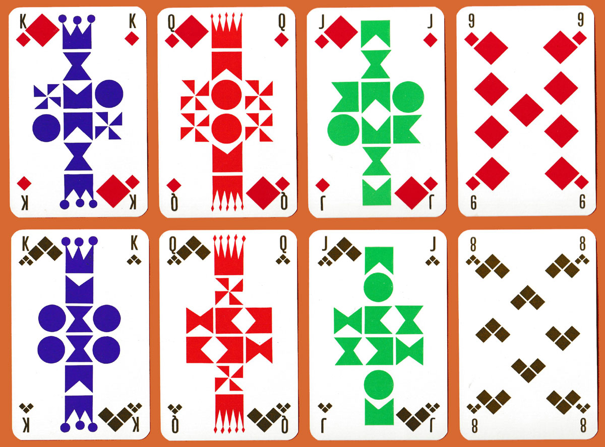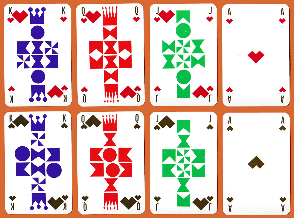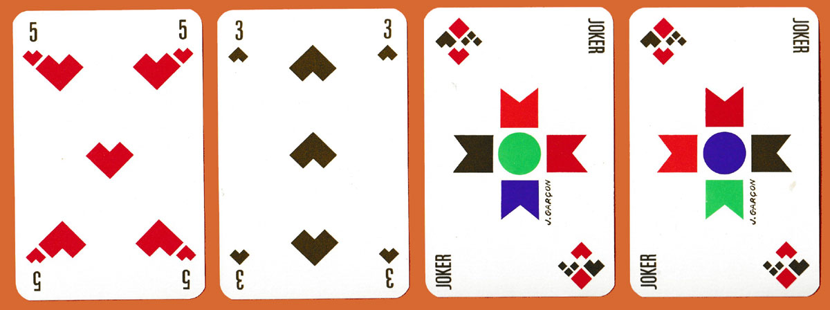 Jean Garçon (1928-2010) was a notable French designer, remembered for his furniture and jewellery designs as well as for several packs of playing cards. In this pack for Knoll International, the furniture company, the court cards and suit-signs have been reduced to basic geometric shapes. Separate colours have then been used to identify each of the court cards: purple for the Ks, orange for the Qs, and green for the Js. The multicoloured Jokers carry the name of the artist. Note that the title cards in the two packs are different: in one the upper text is in dark grey and the lower part in purple, while in the other the colours are reversed. See the box►