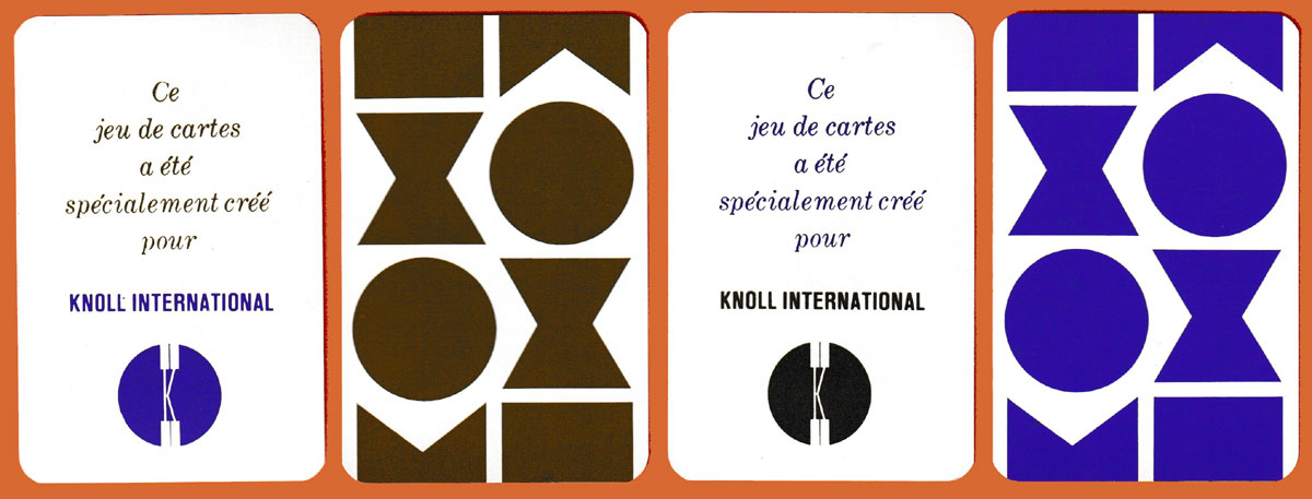 Above: Knoll International promotional playing cards designed by Jean Garçon. Made by Grimaud/France Cartes, France, 1968. 2 x 52 cards + 2 Jokers + 1 title card in double box. Size: 57 x 87.5 mm.