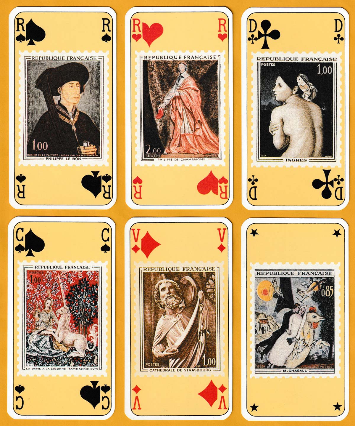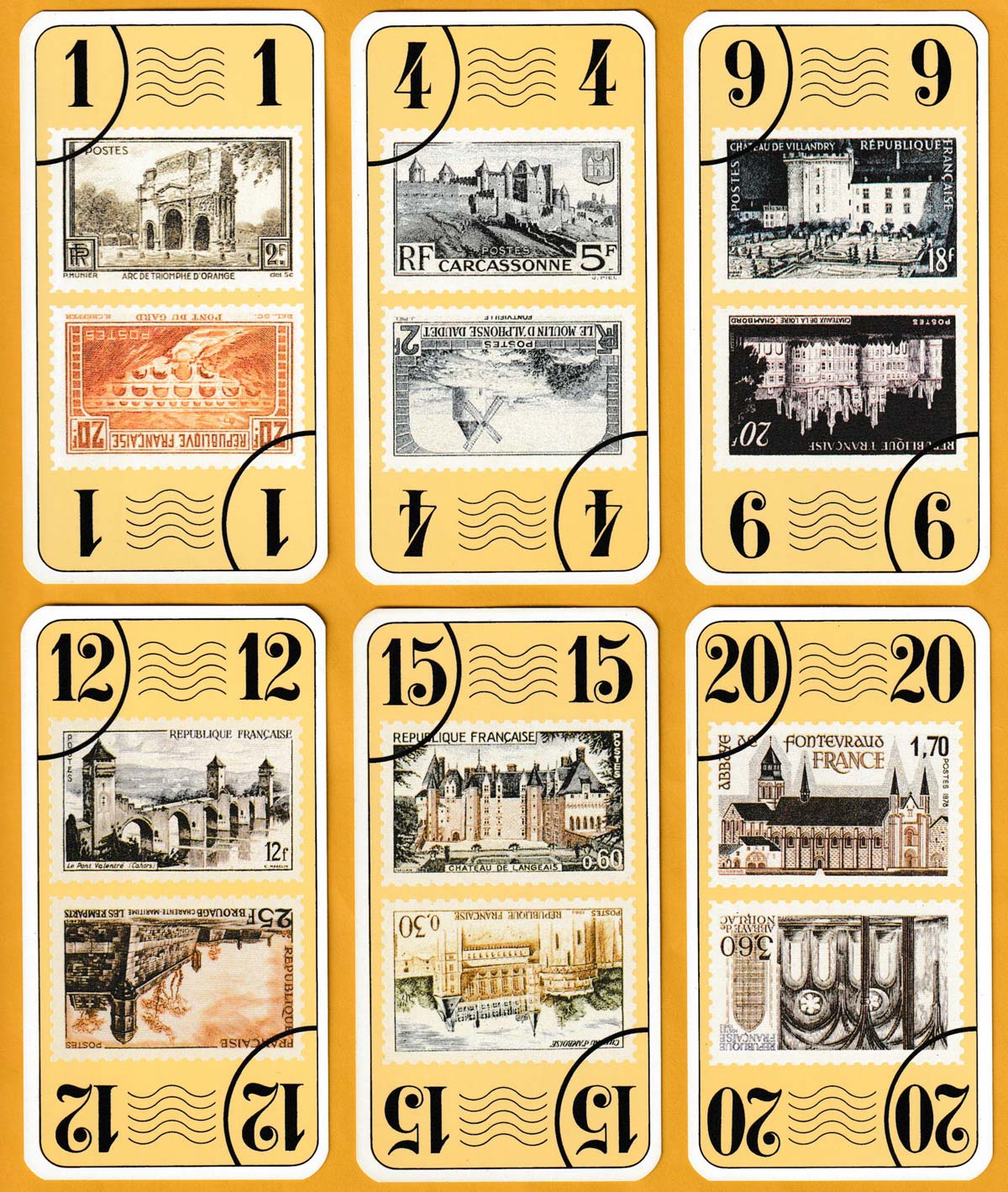The French Post Office (La Poste) has a long history of issuing stamps with either tourist sites and monuments or paintings and other works of art. In this pack, examples of the former appear on the trumps (two on each) and the aces (cathedrals), while examples of the latter adorn the court cards and l’excuse. The reproductions are faithful to the originals in terms of colour and very slightly larger in terms of size. The works of art represent the Middle Ages (D), and the 15th (S), 17th (H), 19th (C) and 20th (l’excuse) centuries. All the stamps are set against a cream-coloured background, while plain white is used on the numeral cards. The back pattern comprises various postmarks and cancellations • See the box