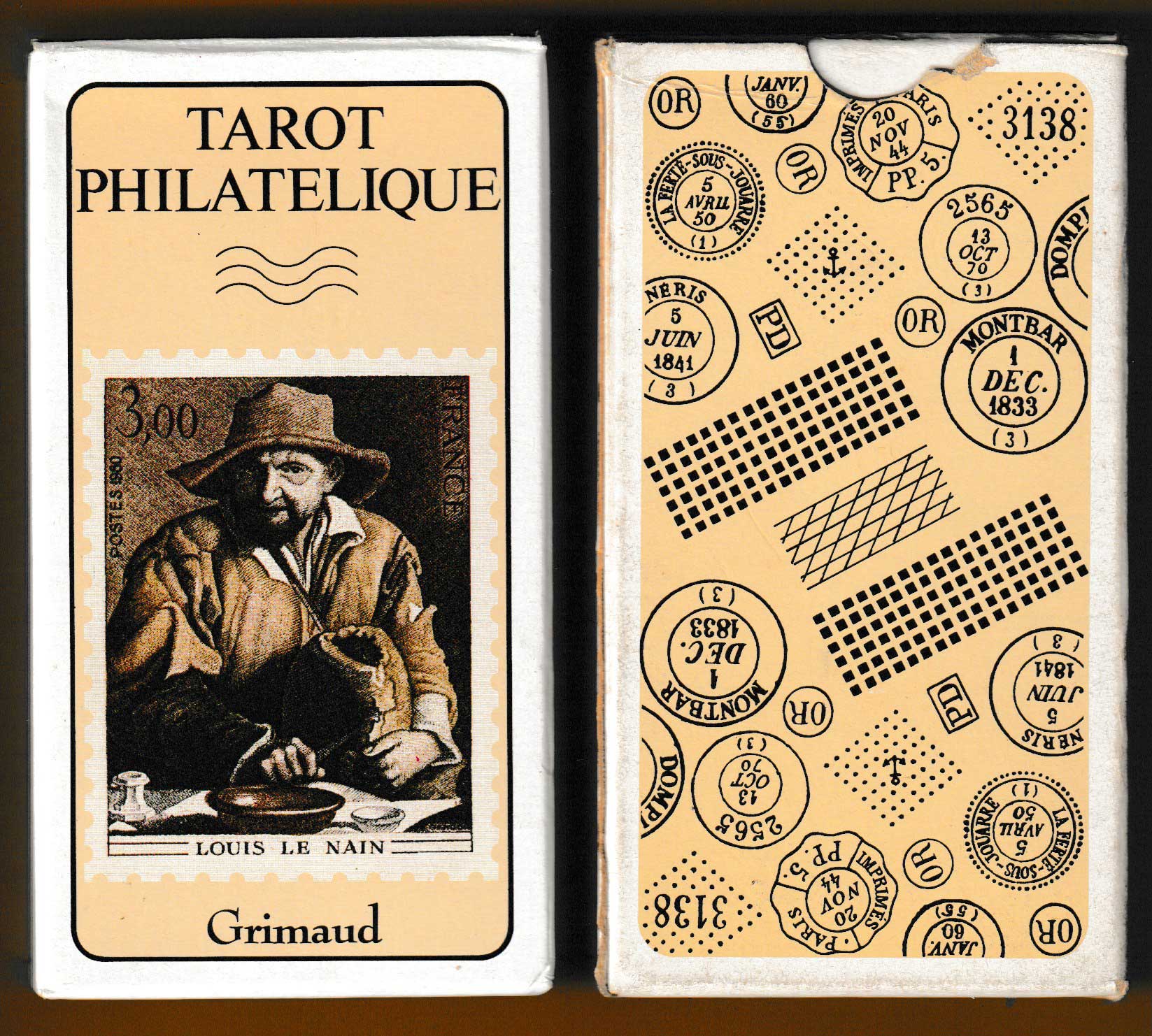 Above: Tarot Philatélique made and published by France Cartes, Saint-Max, France, 1990. 78 cards + 2 extra cards + rules in French in tuck box. Size: 60 x 112.5 mm. © S.P.A.D.E.M. et © A.D.A.G.P. 1990
