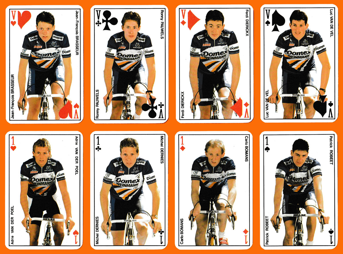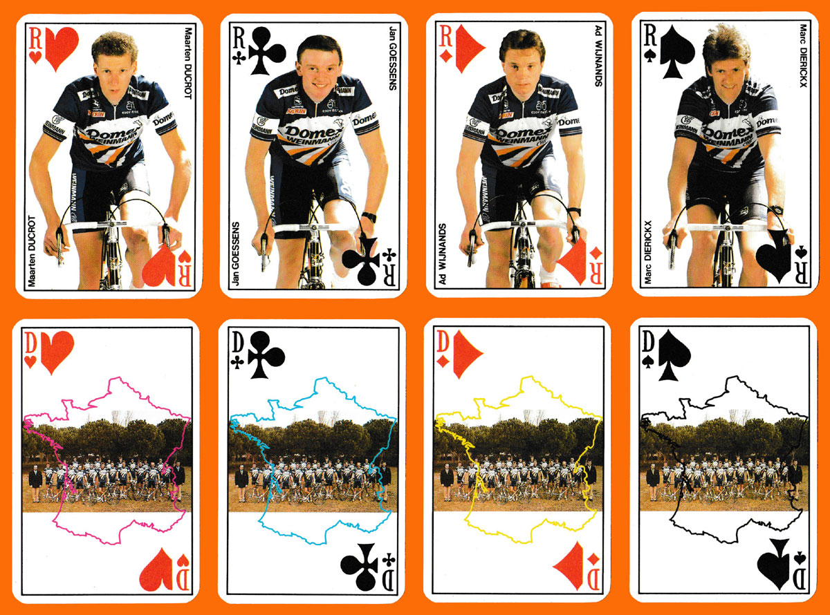 Domex-Weinmann was the name of a short-lived team of cyclists which took part in the 1989 Tour de France. Depicted on the Kings, Jacks, Aces and Jokers are 14 named members of the Domex-Weinmann team; the other seven members are listed on one of the extra cards. An outline map of France has been superimposed on a team photo on all the Queens. The team did not do particularly well that year. The team’s most successful rider throughout 1989 was Thomas Wegmüller, though he only finished 100th in the 1989 Tour de France. Sadly, France Cartes could not spell his name correctly on one of the extra cards – “WEGMUUIR”!