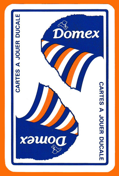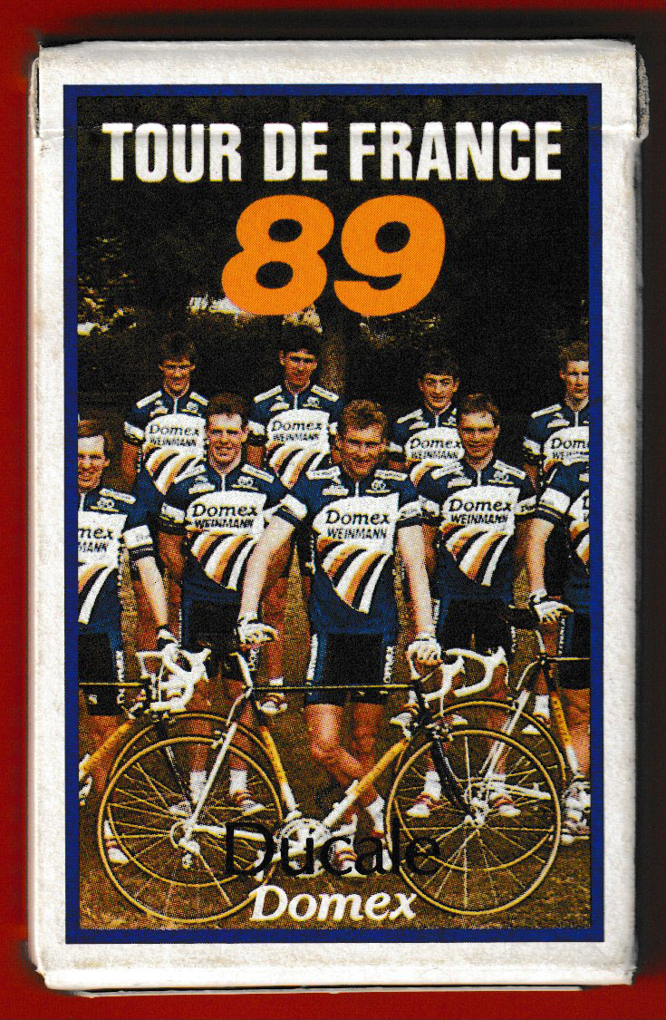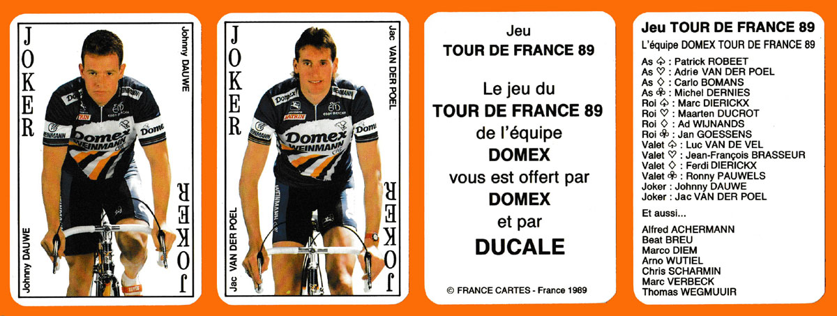 Above: Jeu Tour de France 89 (Domex) made by France Cartes (“Ducale”), Saint-Max, France, 1989. 52 cards + 2 Jokers + 2 extra cards in tuck box. Size: 55.5 x 89 mm. © FRANCE CARTES – France 1989.