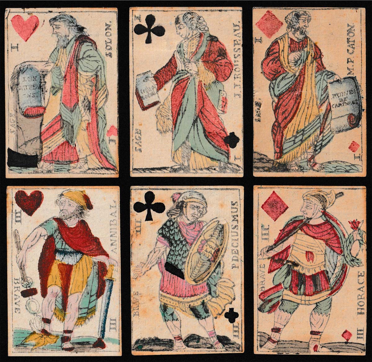 This new pattern is sometimes called the “portrait de Paris révolutionnaire” or SVB III (from the first letters of the names on the court cards). It is characterised by a series of figures from classical antiquity plus Rousseau. These represent “Sages” (K), “Vertus” (Q) and “Braves” (J). Adding to the interest is the fact that these cards have turned suit-signs in the bottom right-hand corner together with indices using Roman numerals: I = roi; II = dame; III = valet. This is one of the first times – if not, the very first time – that such double-ended indices appear on playing cards.