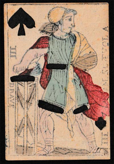 For comparison, please see french-playing-cards►. The subjects there are the same but they have been treated differently: no green colour used and an entirely different form of indexing.