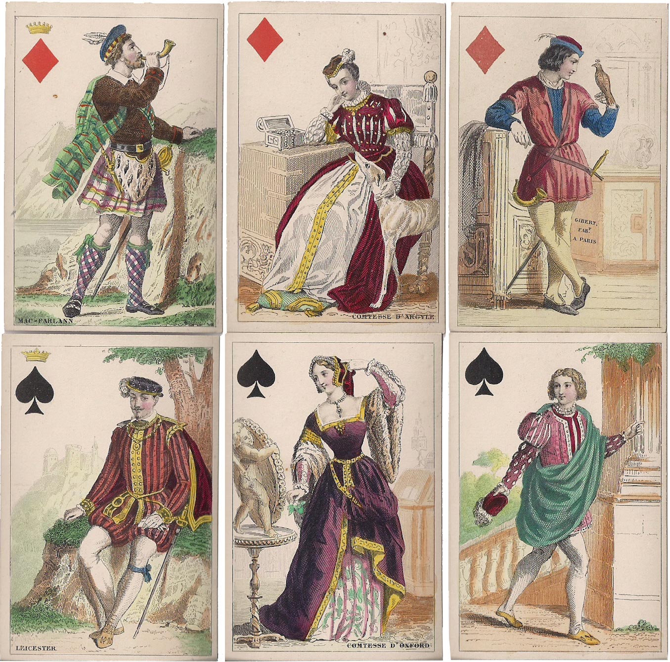 These carefully designed, etched and hand coloured cards depict full-length figures of English historic personages. The King of Hearts is Sir Rhys Thomas (a controversial character in Welsh history), the Queen the Comtesse de Salisbury, the Valet, who carries a helmet in his hand, is unnamed, but the word 'France' is engraved at the left-hand lower corner. The King of Clubs represents Buckingham, the Queen the Comtesse de Marlborough, the Valet, who bears glasses on a salver, is unnamed. The King of Diamonds is Mac-Farlan, the Queen the Comtesse d'Argyle, while the Valet, who bears a falcon on his left hand, is unnamed, but the card has the address, "Gibert Fabr. a Paris," at the background. The King of Spades is Leicester, the Queen the Comtesse d'Oxford, the Valet is unnamed. The suit signs on the Kings have a crown above them, and those on the Aces are contained within arabesque ornaments.