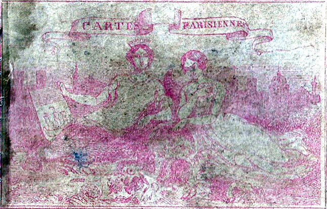 The suit symbol on a given character is not always the same as in other examples of the same deck. That is because, being hand coloured, there was no consistency from deck to deck. There also seems to be some confusion regarding the titles of these similar French costume decks. In particular, this "Cartes Parisiennes" deck is also known as "Jeu de Costumes Historiques Anglais".