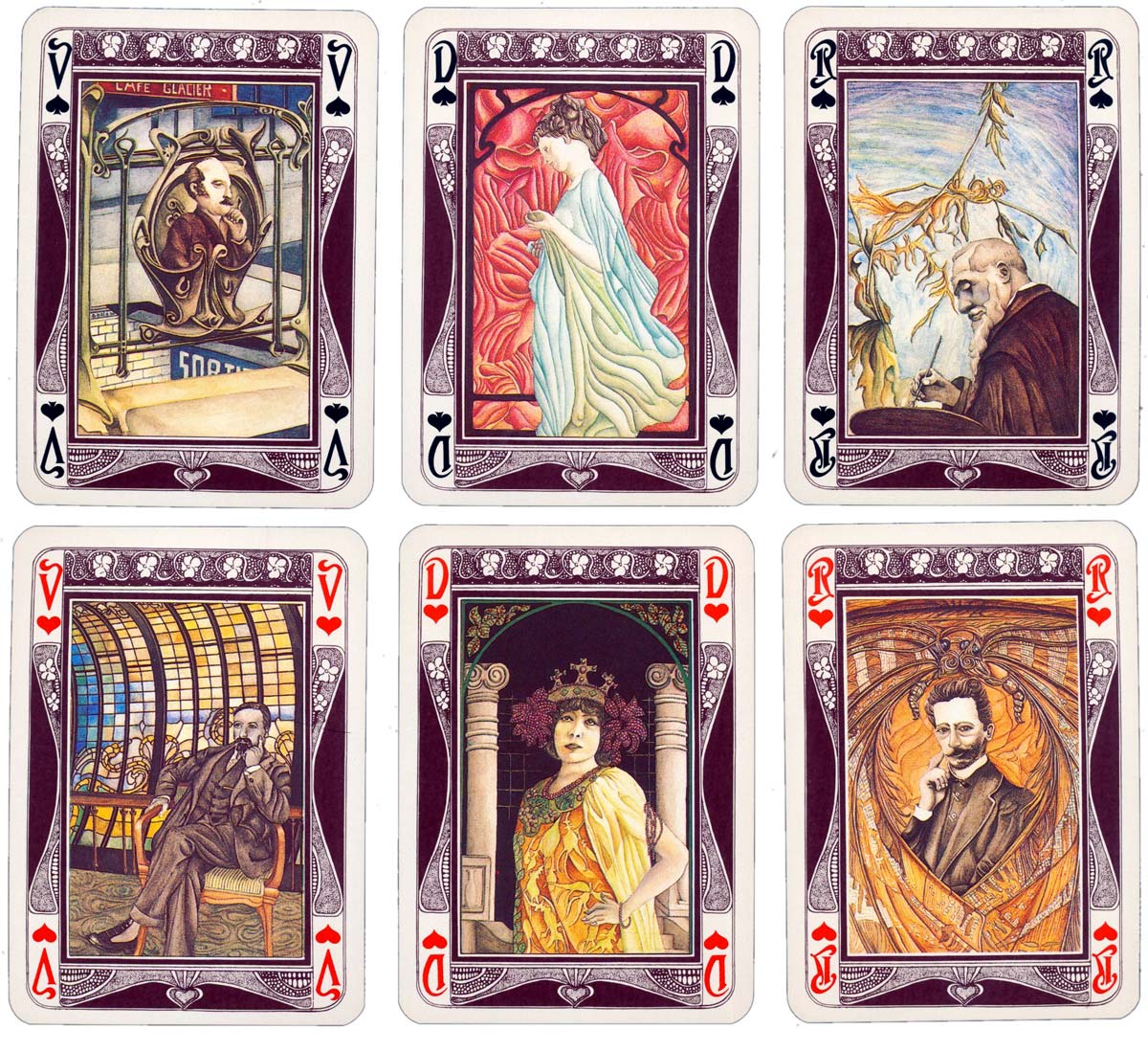 ‘Jeu de Cartes 1900’ designed by Marie Christine Schira in the Art Nouveau or Jugendstil style, Grimaud, 1979. The court cards depict famous persons from that era whose work influenced the spread of Art Nouveau around the world, including Antonio Gaudí, Sarah Bernhardt, Émile Gallé, Louis Tiffany, Victor Horta, Jacques Grüber, etc.