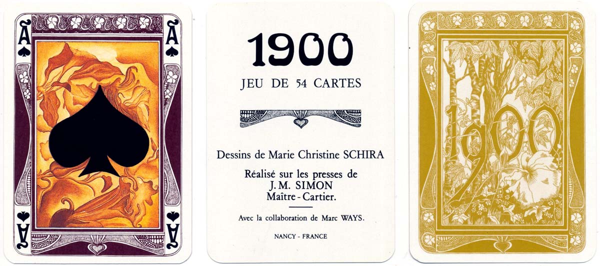 Above: ‘Jeu de Cartes 1900’ designed by Marie Christine Schira in the Art Nouveau or Jugendstil style, Grimaud, 1979. 52 cards + 2 jokers + title card in box; card size = 89mm x 63mm.
