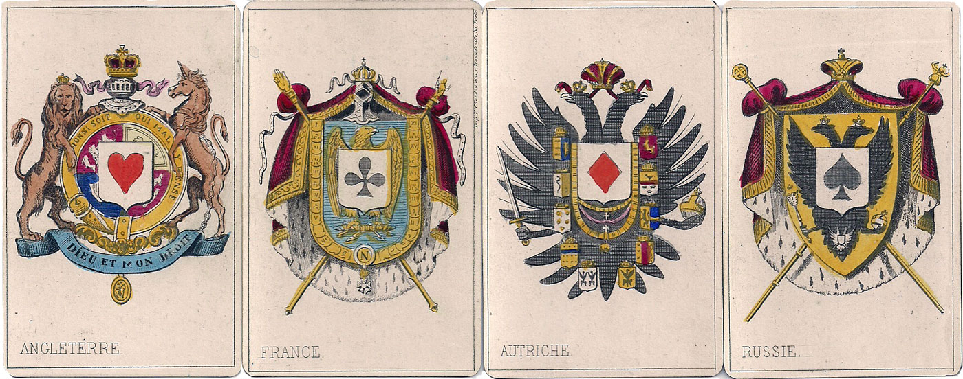 Cartes Imperiales et Royales were first published by B. P. Grimaud & Cie with full-length court figures representing imperial rulers and consorts from Austria, England, France & Russia an the mid-19th century. The four kings are the Prince Consort of England, the Emperor Napoleon III, the Emperor of Austria and the Tsar of Russia. The queens are Queen Victoria, the Empress Eugenie, the Empress of Austria and the Tsarina. The knaves are a jockey, a royal huntsman, an imperial groom and a royal serf. The four aces carry the arms of England, the imperial arms of France and the arms of Austria and Russia. A shield of pretence at the centre of each armorial bearing carries the suit symbol (click to zoom).