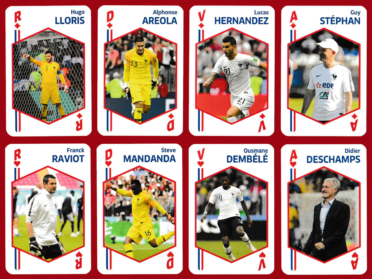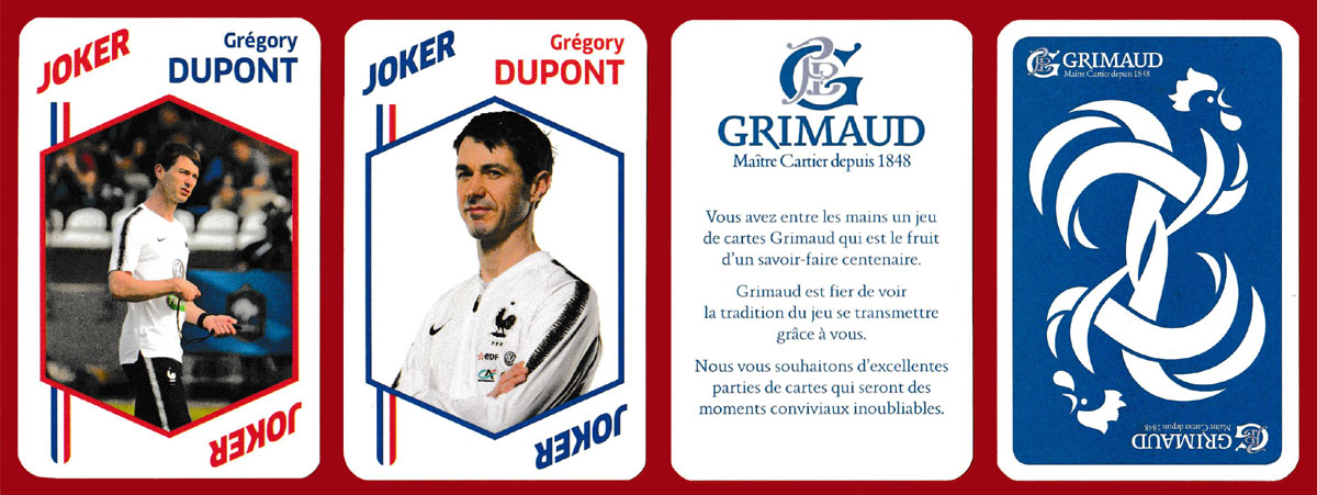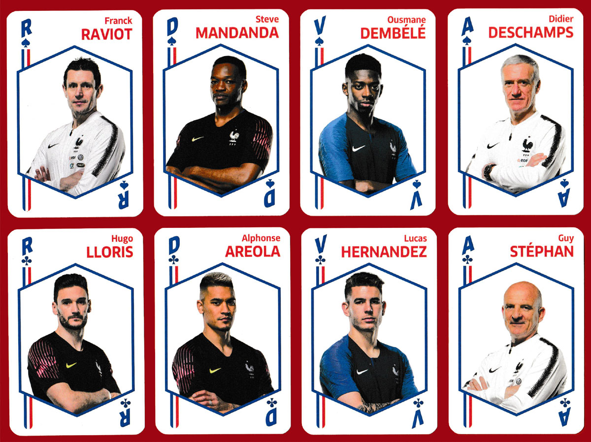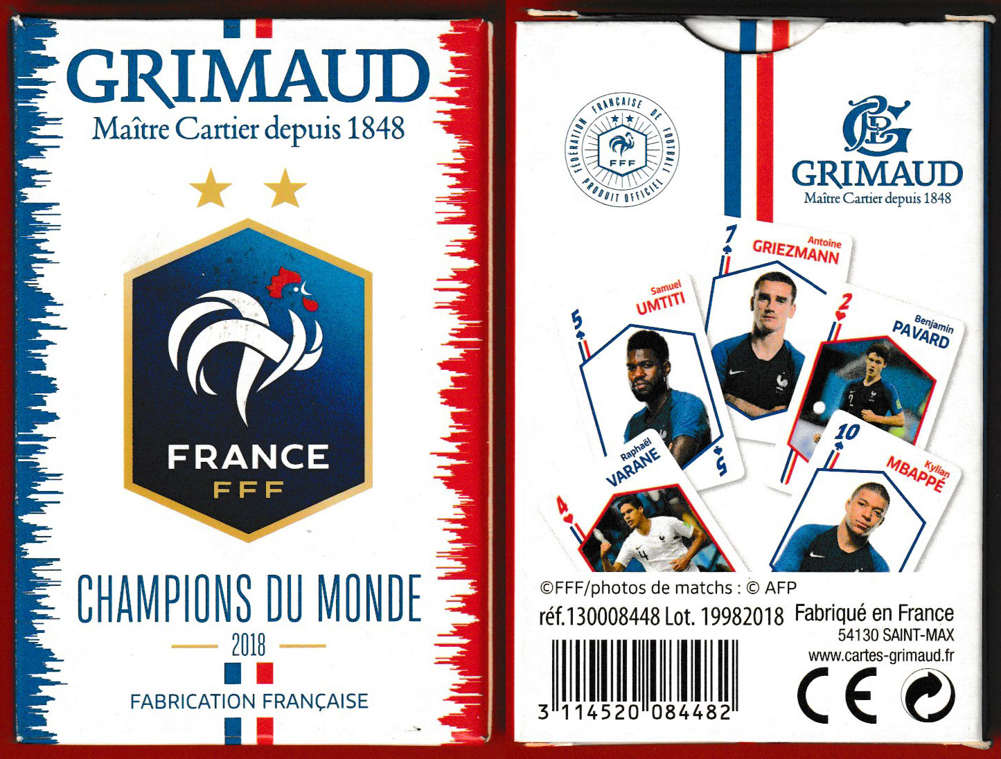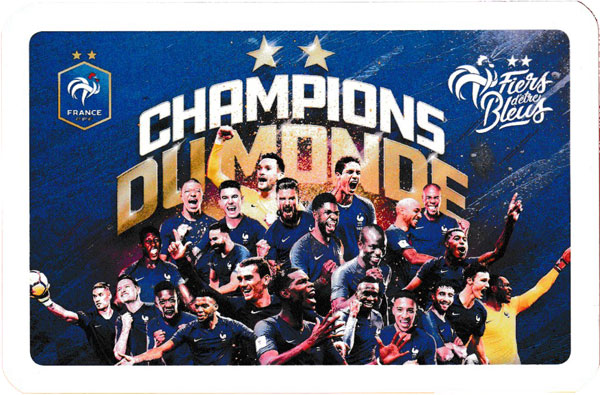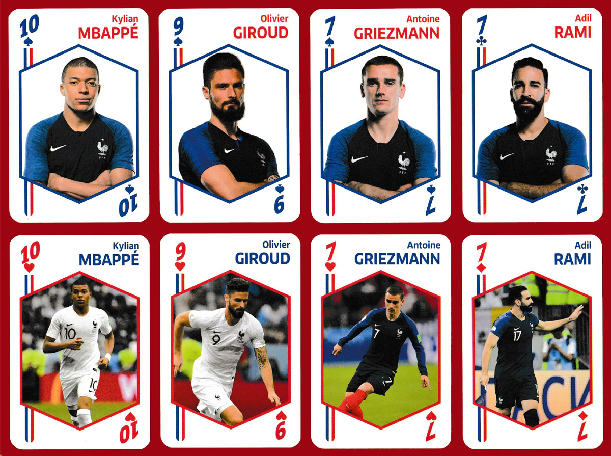 Above: ‘France, Champions du Monde 2018’ playing cards printed and published by Grimaud (France Cartes), France, 2018. 52 cards + 2 Jokers + 1 extra card (with a different back design) in tuck box. Size: 55 x 84 mm. ©FFF/photos de matchs : © AFP