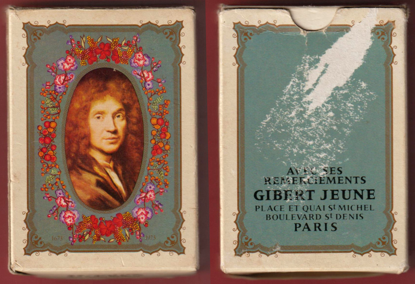 Above: Molière tricentenary playing cards published by Gibert Jeune bookshop, made by B.P. Grimaud, Saint-Max, France, 1973. 52 cards + 2 (identical) Jokers + 2 extra cards in tuck box. Size: 63 x 88 mm.