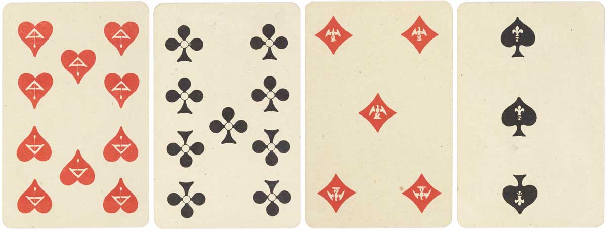 This French political pack was created during a period of significant socio-political upheaval, designed to reflect contemporary current affairs as a form of entertainment. The early 1870s were marked by the aftermath of the Franco-Prussian War, the fall of the Second Empire and the establishment of the Third Republic. The 12 non-standard court cards represent the republic (hearts), the constitutional monarchy (clubs), the Empire (diamonds) and spades the legitimate monarchy. The four suit symbols have also been adapted into emblems representing forms of government • See the wrapper
