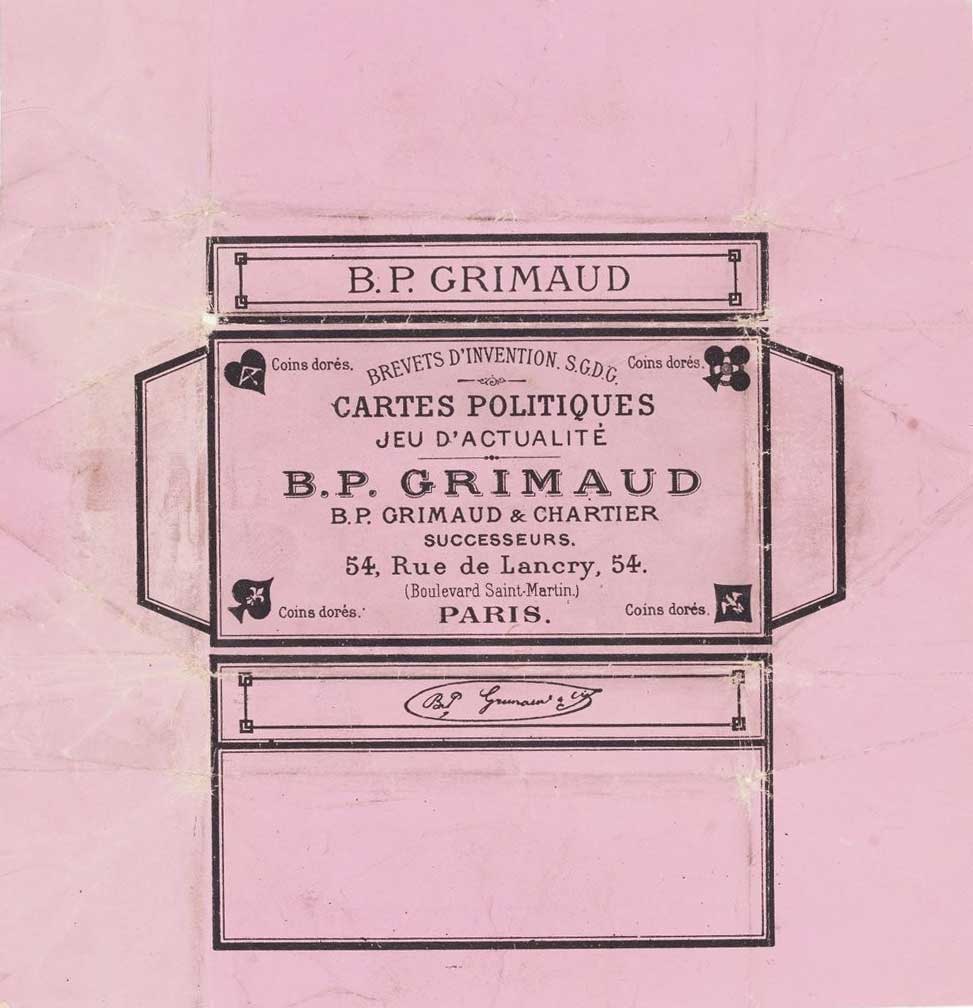 Above: Political playing cards (‘Jeu d'actualité’) published by Grimaud et Chartier, Paris, 1872. 52 cards + wrapper, rounded and gilded corners, chromolithography, 8.6 x 5.6 cm. Backs plain blue or pink. Bibliothèque nationale de France