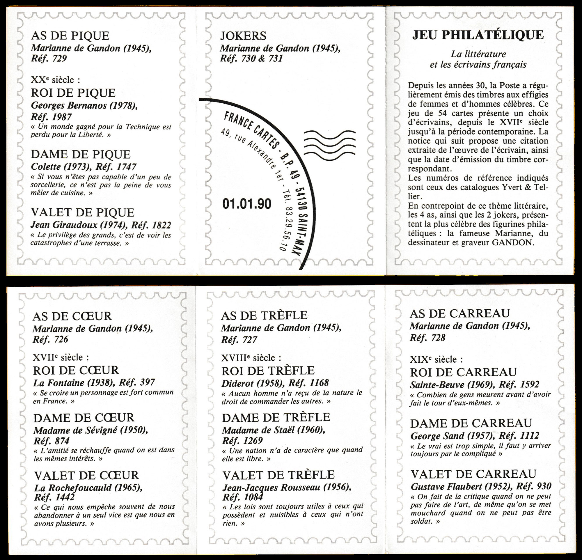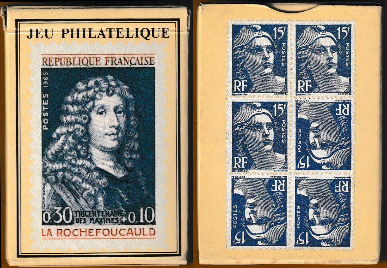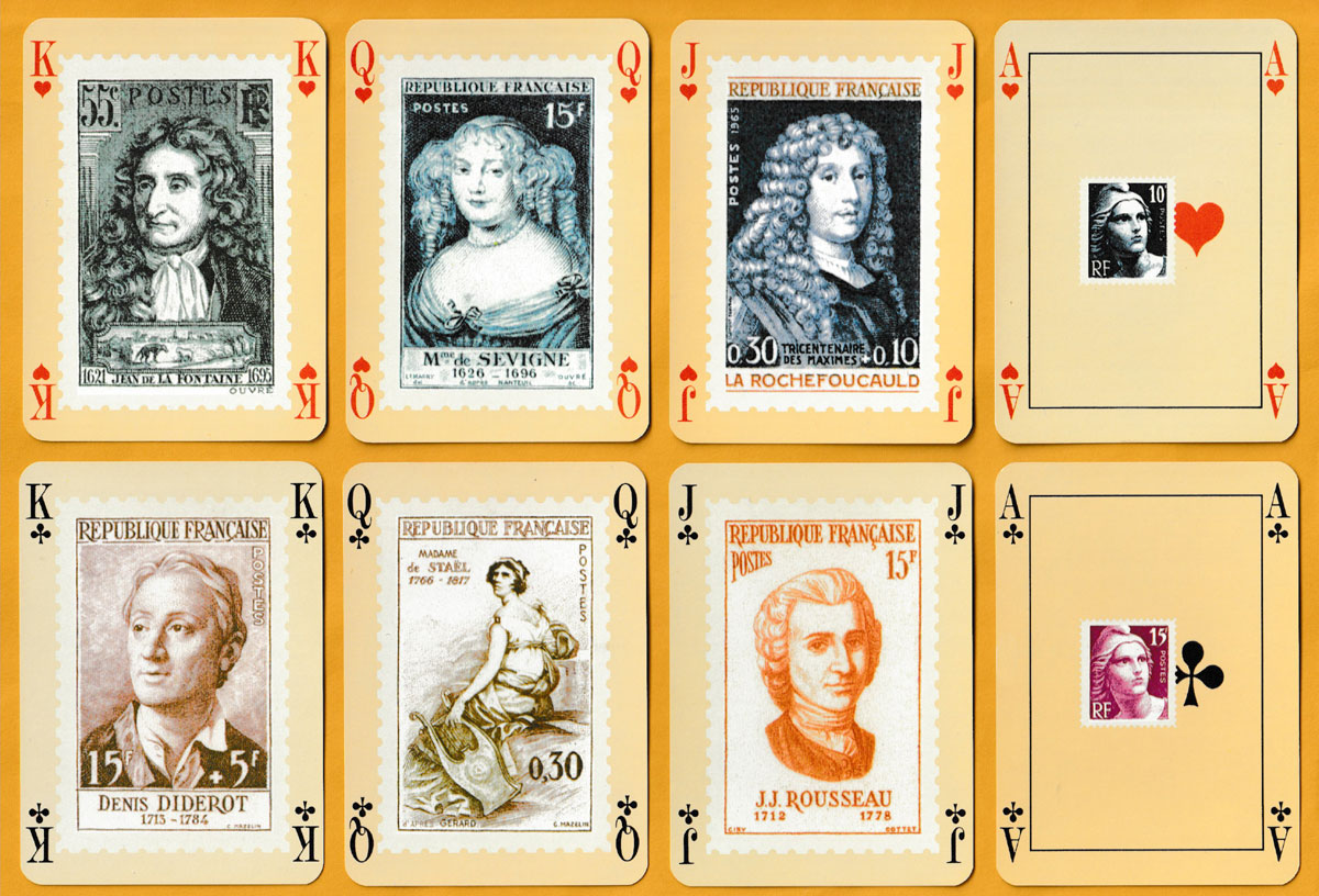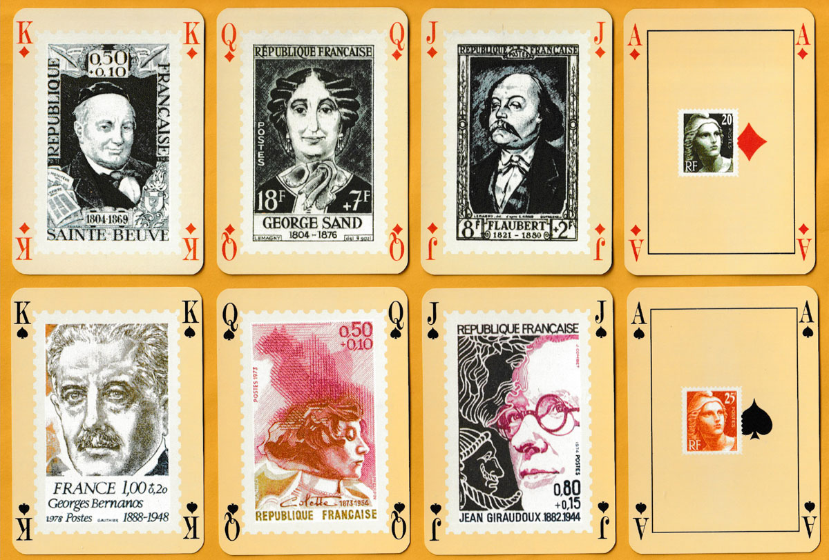 With the French Post Office (La Poste) having a long tradition of producing stamps featuring famous authors, it was not difficult to find twelve to grace the court cards of this pack. They include La Fontaine, Rousseau, Flaubert and George Sand. On the aces and Jokers are different stamp values from the Marianne series of 1945 designed by Pierre Gandon (1899-1990). Every card has a cream-coloured background. A block of Marianne stamps designed and engraved by Gandon can also be found on the reverse, either in blue (as here, 15F) or in red (3F) • See the box