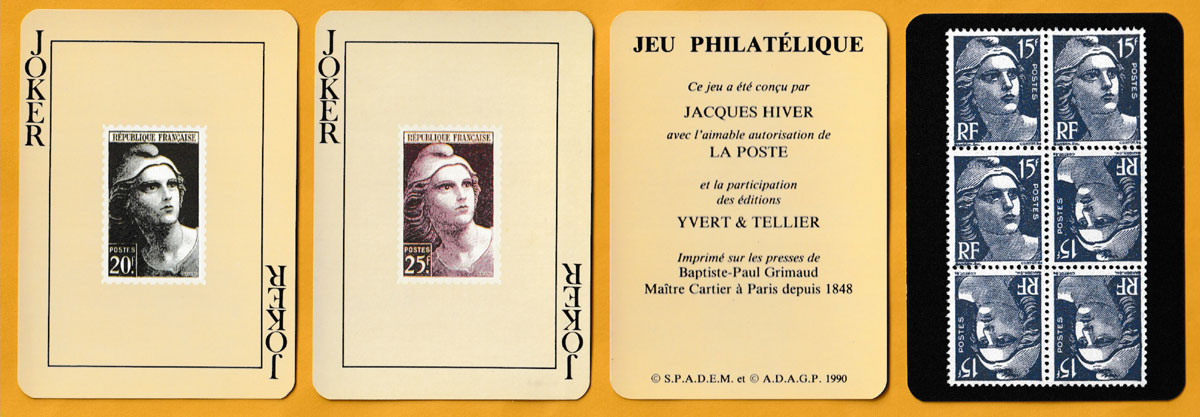 Above: Jeu Philatélique made and published by France Cartes, Saint-Max, France, 1990. 52 cards + 2 Jokers + leaflet in French in tuck box. Size: 63 x 88 mm. © S.P.A.D.E.M. et © A.D.A.G.P. 1990