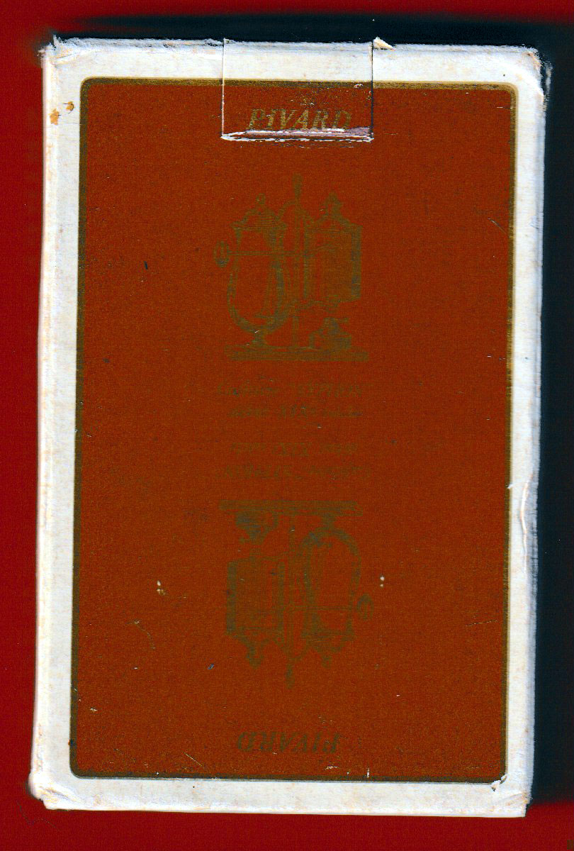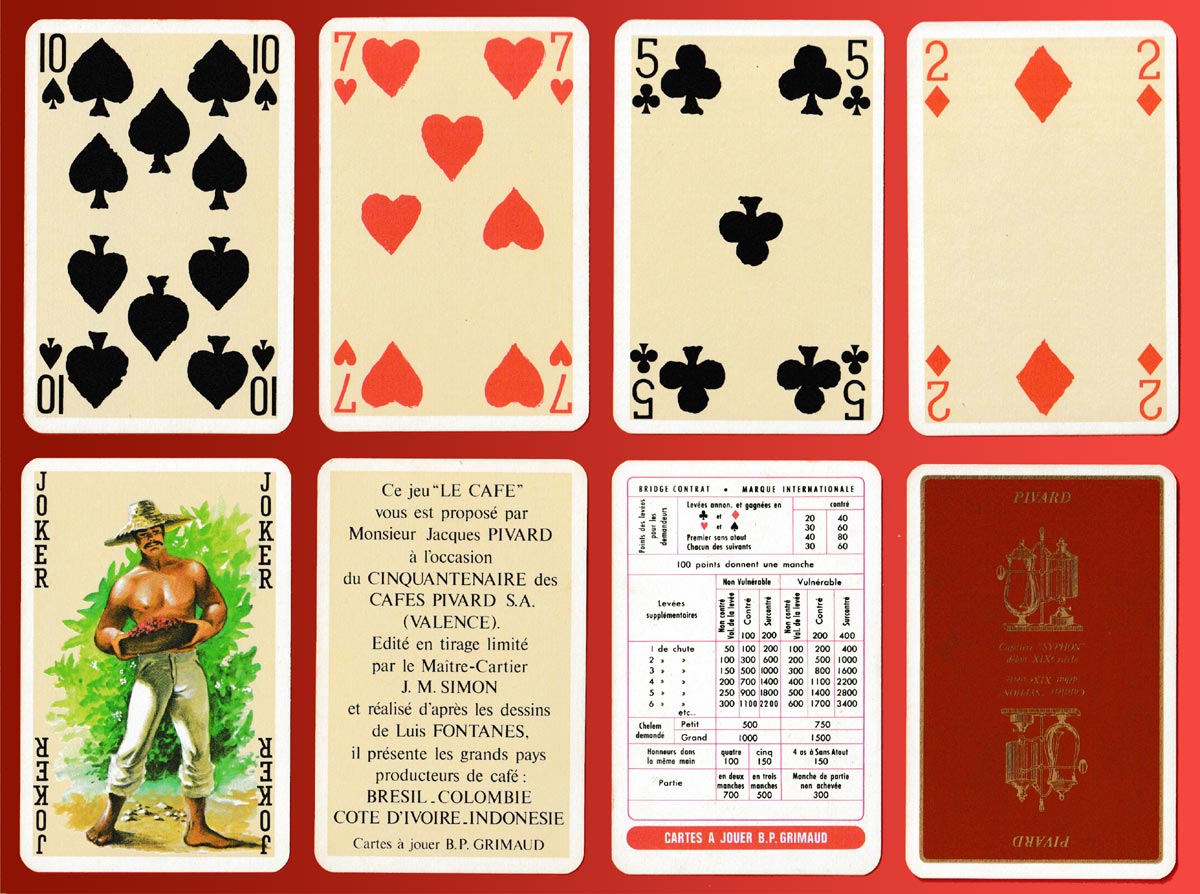 Above: “Le Café” playing cards manufactured by B.P. Grimaud for Cafés Pivard S.A., Valence, France, 1976. 52 cards + 2 (identical) Jokers + title card + bridge score card in tuck box. Size: 58 x 89 mm. The box is the same front and back and merely reproduces the back design.