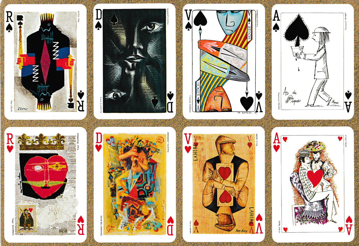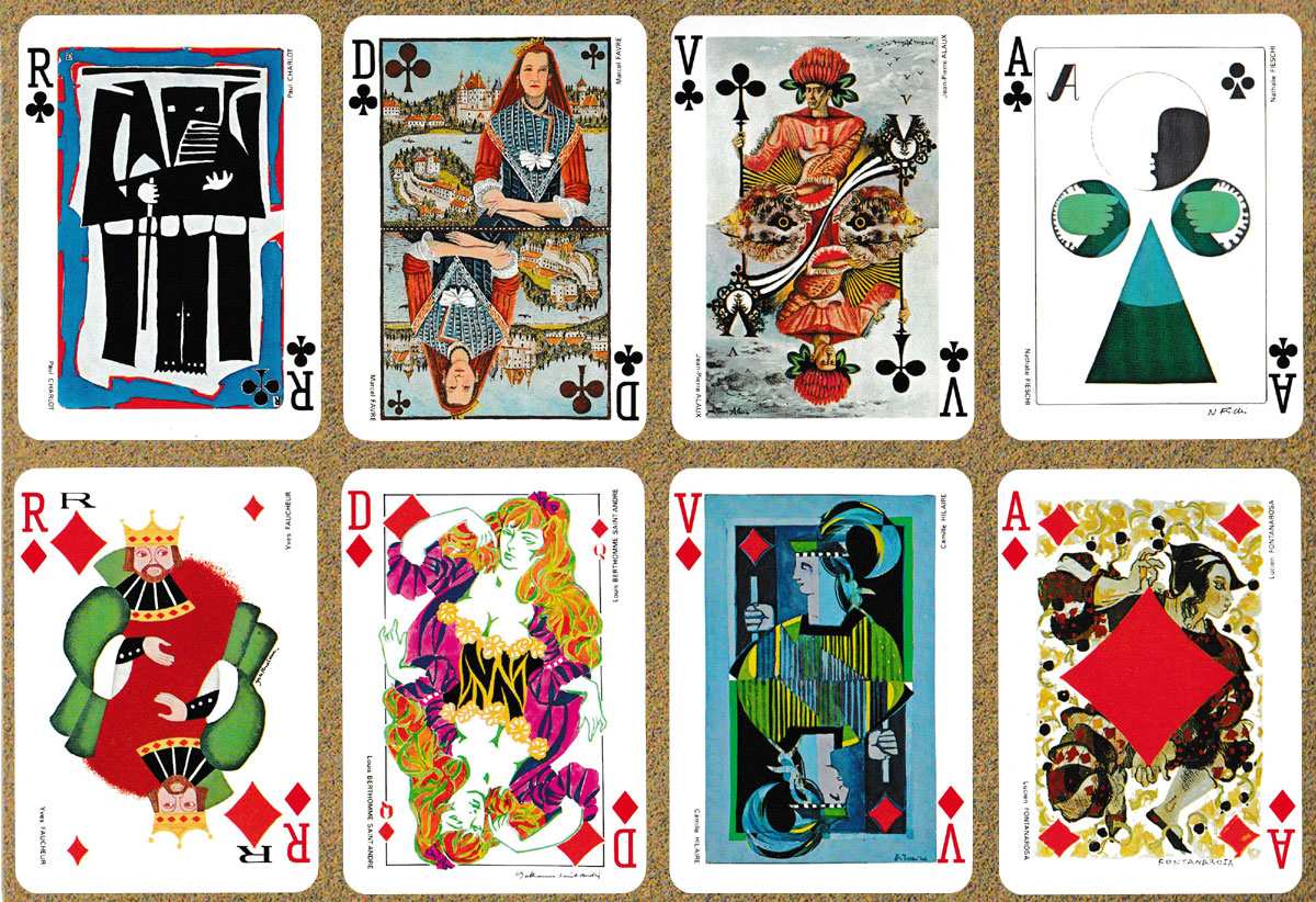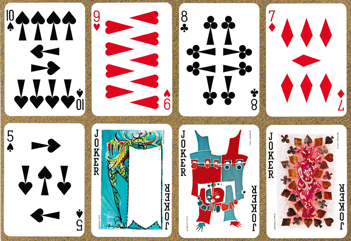Fifty years ago, when this pack was produced, it was a revolutionary idea to bring together the work of 19 different artists in one pack. Since then, collective or collaborative packs have become commonplace. This one was compiled by André François. The 19 artists were responsible for designing the courts, Aces and Jokers, and are named twice on each. In addition, one of the artists, James Hodges (1928-2019), created the unusual pip designs and formations. The courts are mainly double-ended and are in a wide variety of styles. Most of the artists have signed their work. The Ace of Spades was designed by Raymond Peynet (1908-1999), also known for the pack called Les Amoureux de Peynet. Three extra cards provide biographical details in French about all 19 artists.
