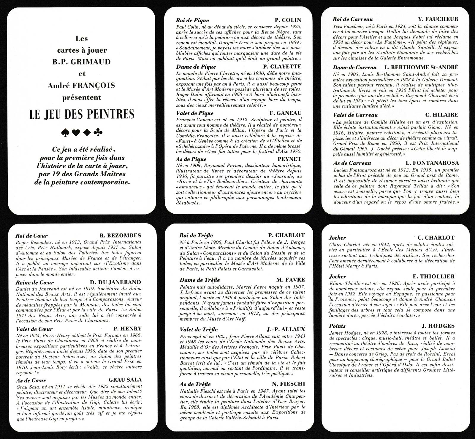 Above: Le Jeu des Peintres made by B.P. Grimaud, France, 1973. 52 cards + 3 Jokers + 3 double-sided cards with text in French, in tuck box. Size: 63 x 88 mm.