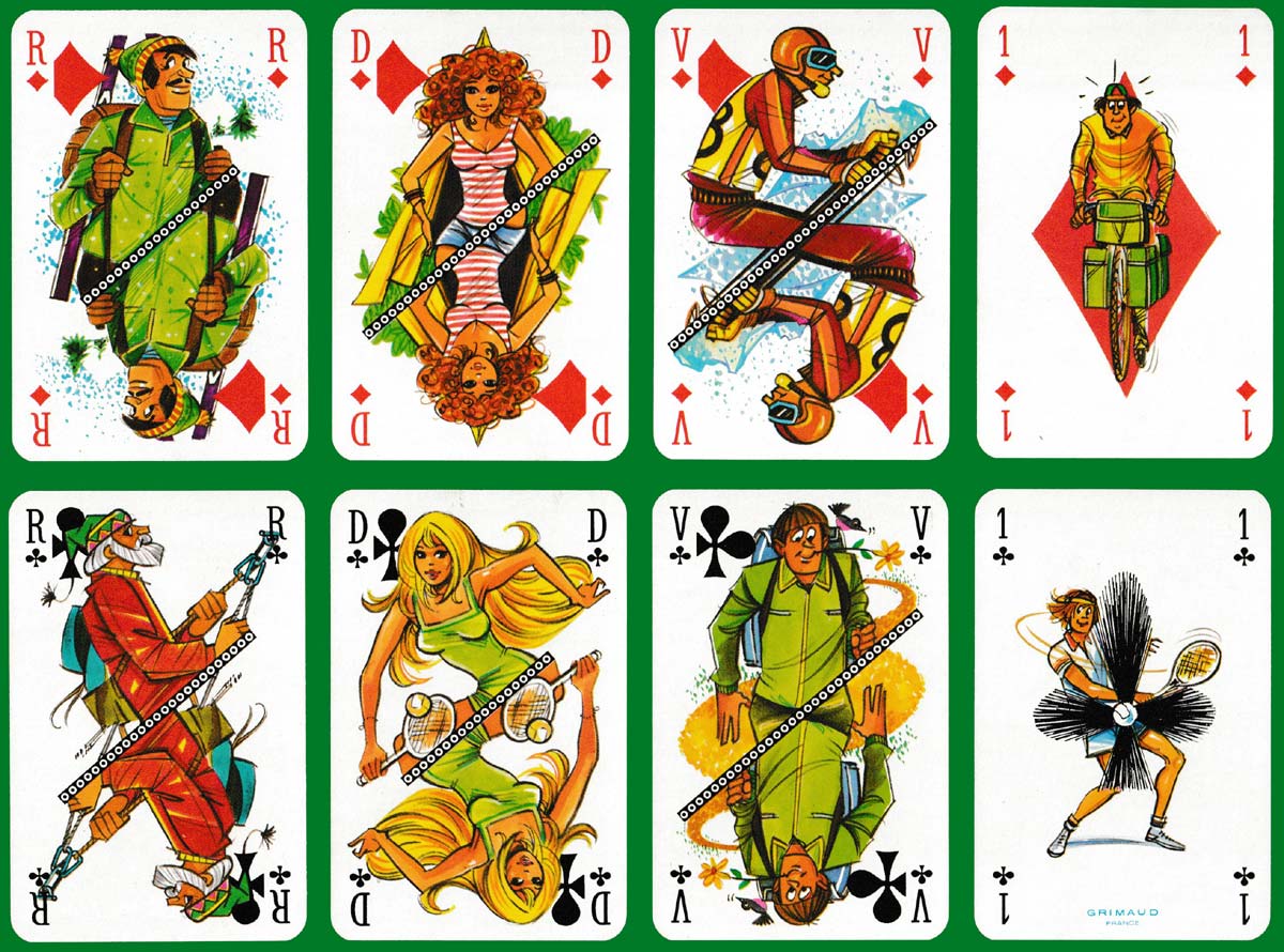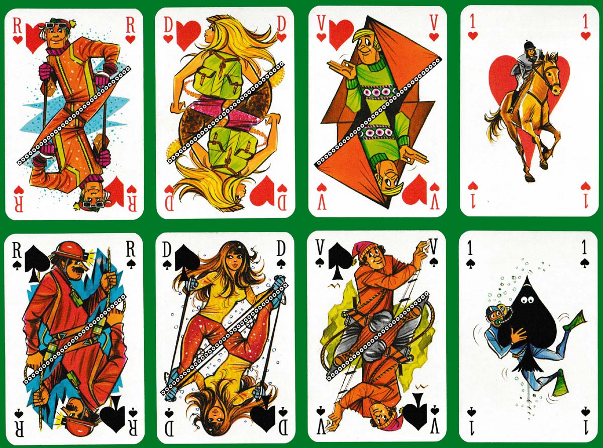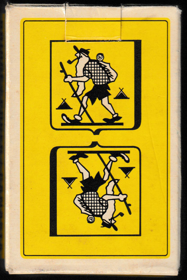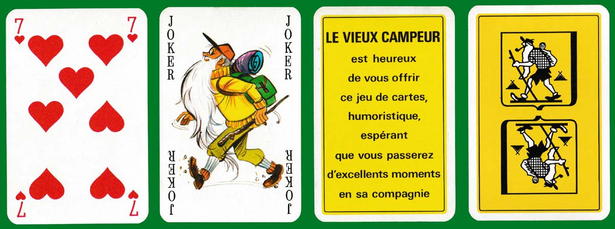Humorous designs by the prolific artist James Hodges (1928-2019) for Le Vieux Campeur, a business in Paris specialising in the sale of camping equipment (rucksacks, tents, etc.) to young and old alike. Many different outdoor activities are represented on the court cards, which are divided diagonally. Hodges’ style is instantly recognisable, especially on the queens, with their flowing locks. Inspiration for the Joker design must have come from the logo of the business which has been used for the back design and the box►