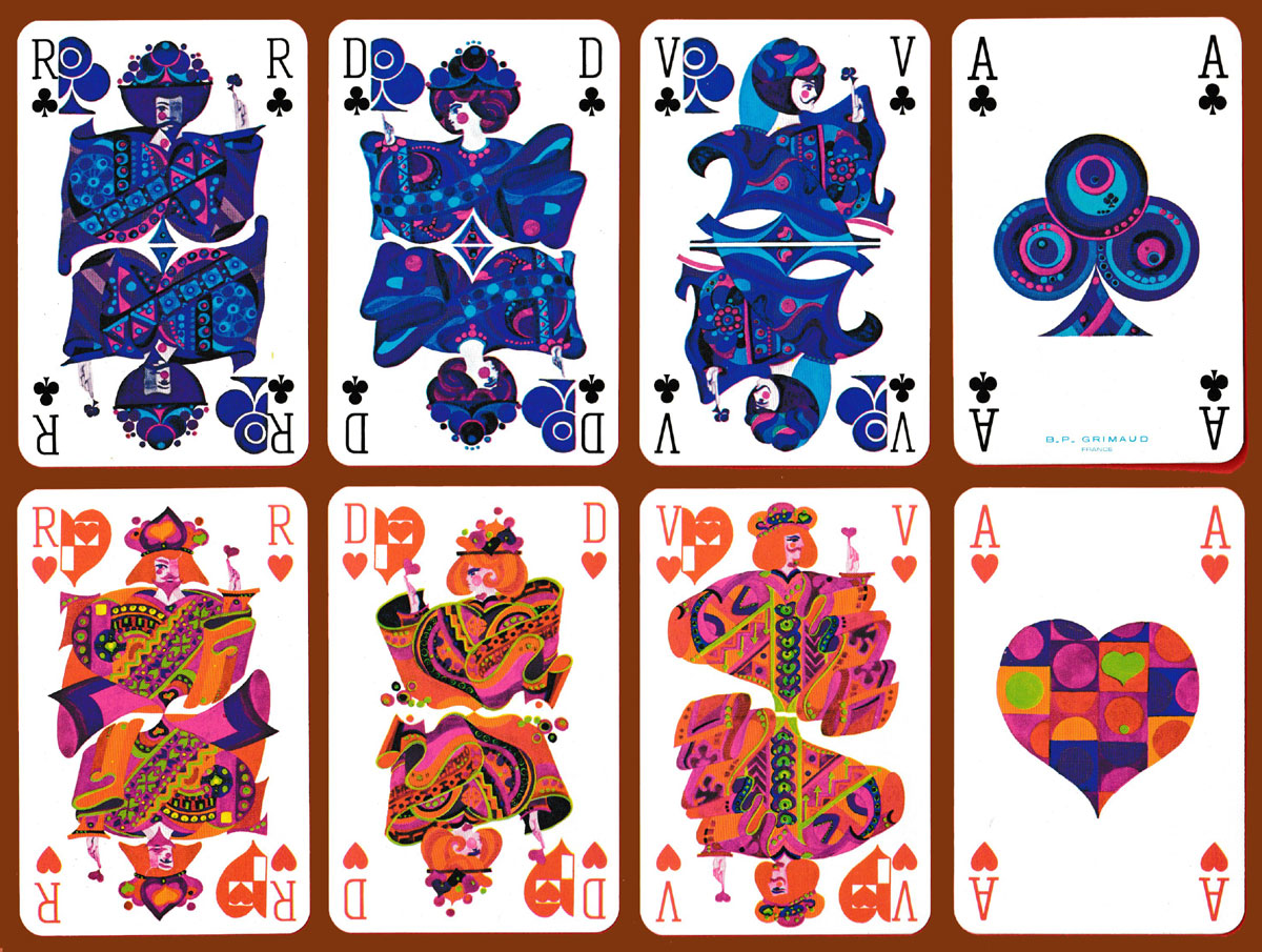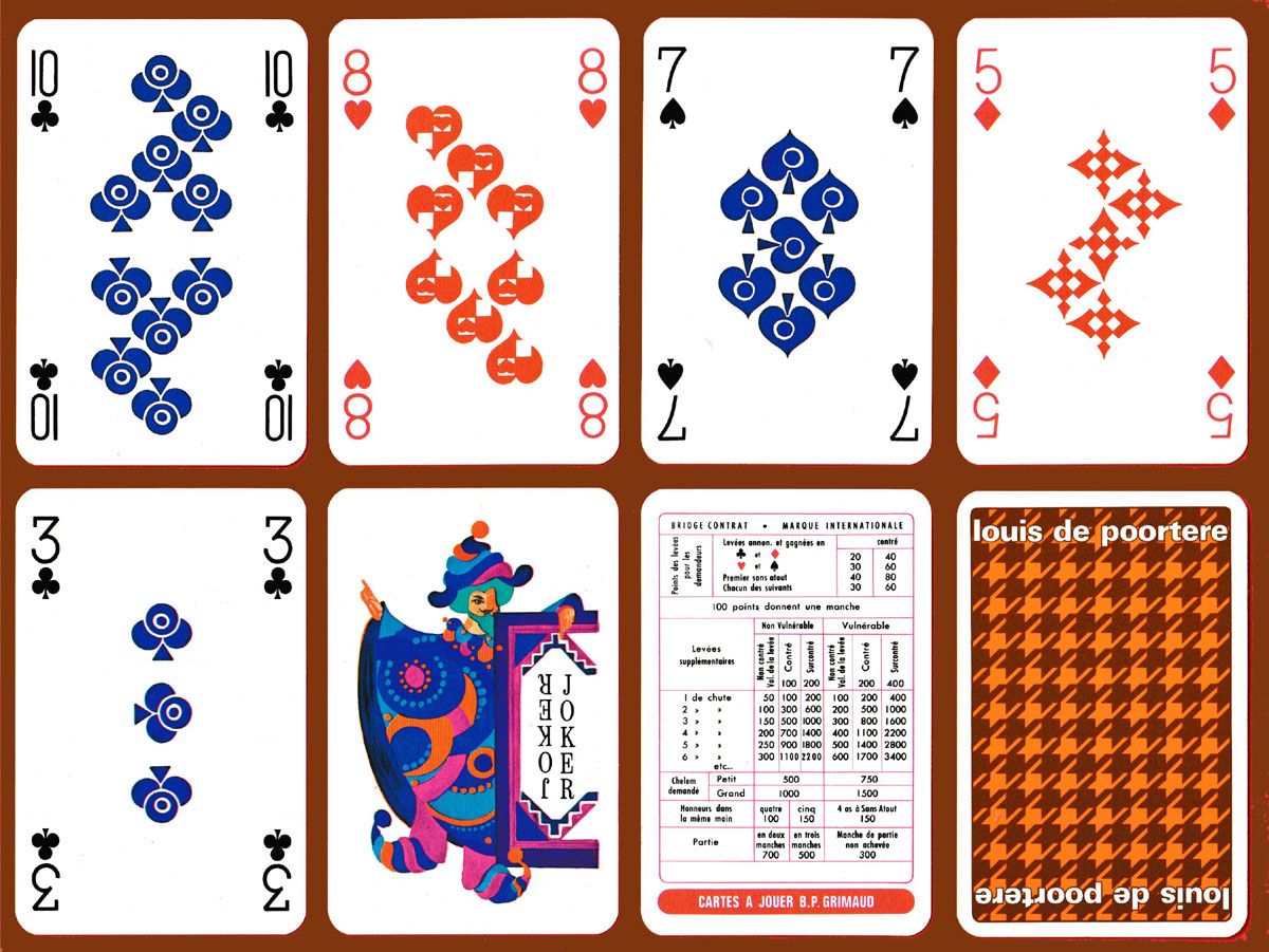 Above: Louis De Poortere playing cards made by B.P. Grimaud, France, c1975. Artist unknown. 52 cards + 2 (identical) Jokers + 1 bridge score card. Size: 58 x 89 mm.