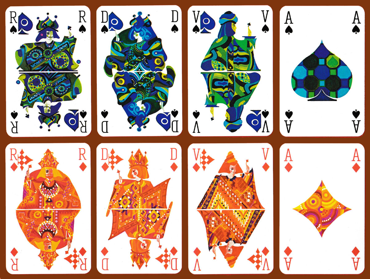 Louis De Poortere is a Belgian company specialising in carpets, rugs and stair runners. Presumably this pack was made for them in the 1970s to promote their products. The designs are psychedelic, with a different range of colours used for each set of double-ended court cards. Furthermore, the enlarged pips on the court cards and the pips on the numeral cards are both non-standard (purple on the black suits) and arranged in a non-standard fashion. The back design in orange and brown, with “louis de poortere” in white at each end, is reminiscent of a piece of fabric. No artist is credited with the designs.