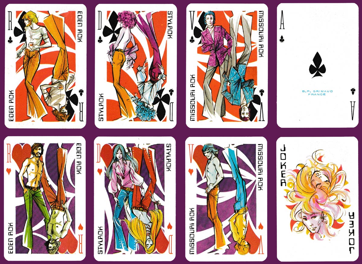 Above: designs by James Hodges manufactured by B.P. Grimaud for Ets H. Roquette et fils, Lille, France, 1972. 52 cards + 2 (identical) Jokers + bridge score card + title card. No box. Size: 55 x 84 mm.