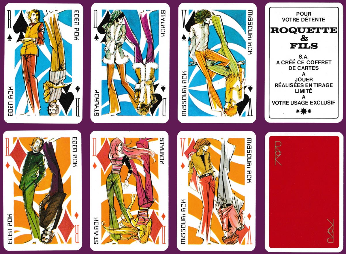Promoting a new season’s garments by way of a pack of cards is not uncommon, but here James Hodges has applied his unique style to great effect in a set for the Lille-based clothing company, H. Roquette et fils, a business which lasted from 1956 to 1989. The company specialised in tops, trousers and jackets for men, women and boys. Examples of these are illustrated on the "head-to-toe” court cards against brightly coloured backgrounds (a different background colour for each suit). The shapes of the pips have been artistically modified. The back design is sober by comparison.