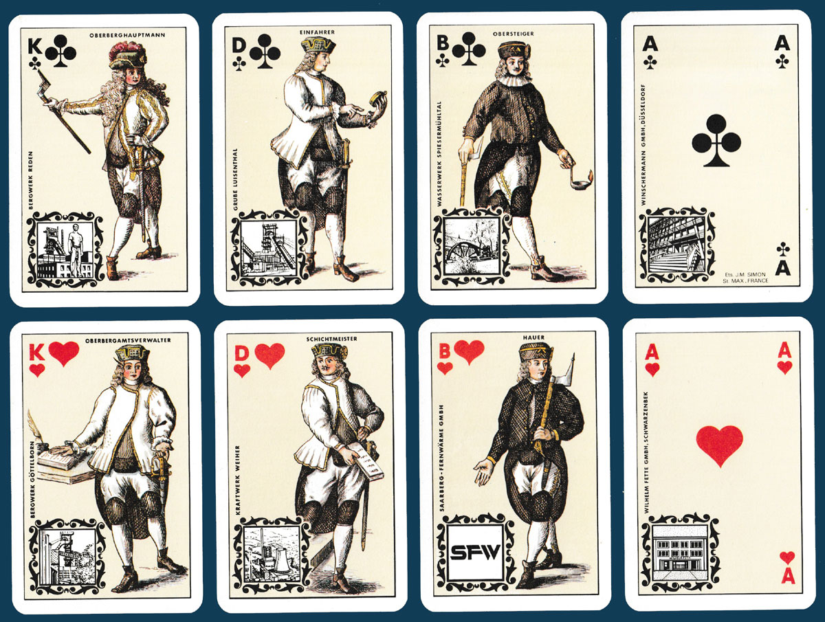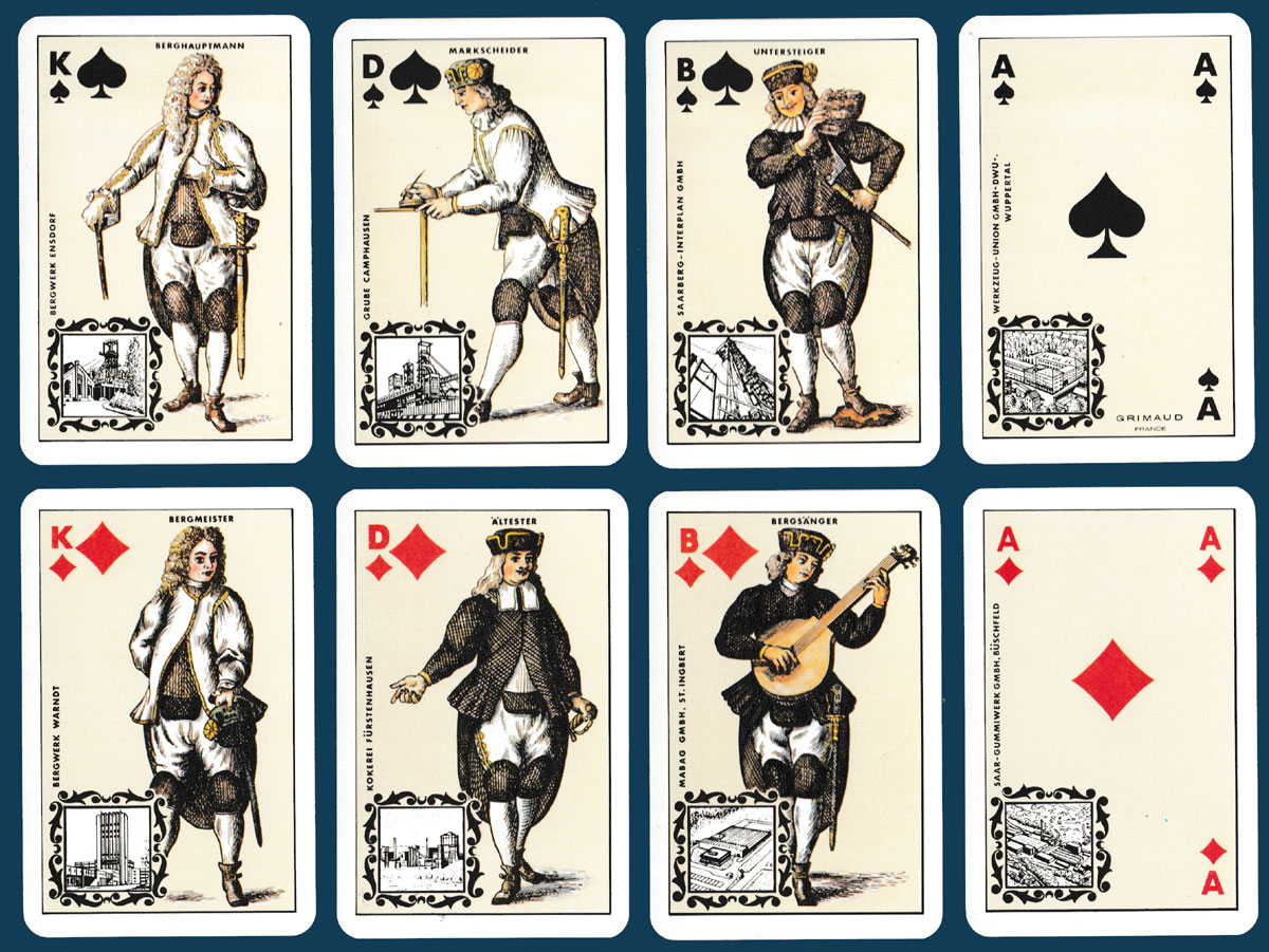 Starting in 1974, the Saarberg mining company began issuing an annual pack of cards with a mining theme. This was distributed along with their Saarbrücker Bergmannskalender as an add-on. The pack for 1979, with designs by Fritz Ludwig Schmidt, features miners in historical costume with insets of Saarberg mines and other buildings. The KS is a Berghauptmann (chairman of a regional inspectorate of mines). All the figures appear to be wearing kneepads. The cards were printed by Grimaud, across the border from Saarbrucken in St. Max, just outside Nancy.