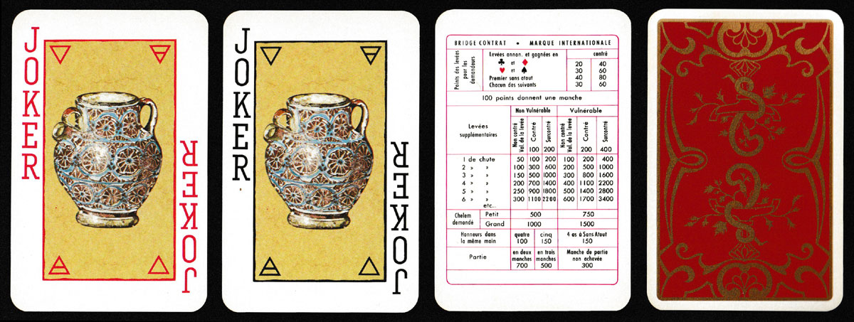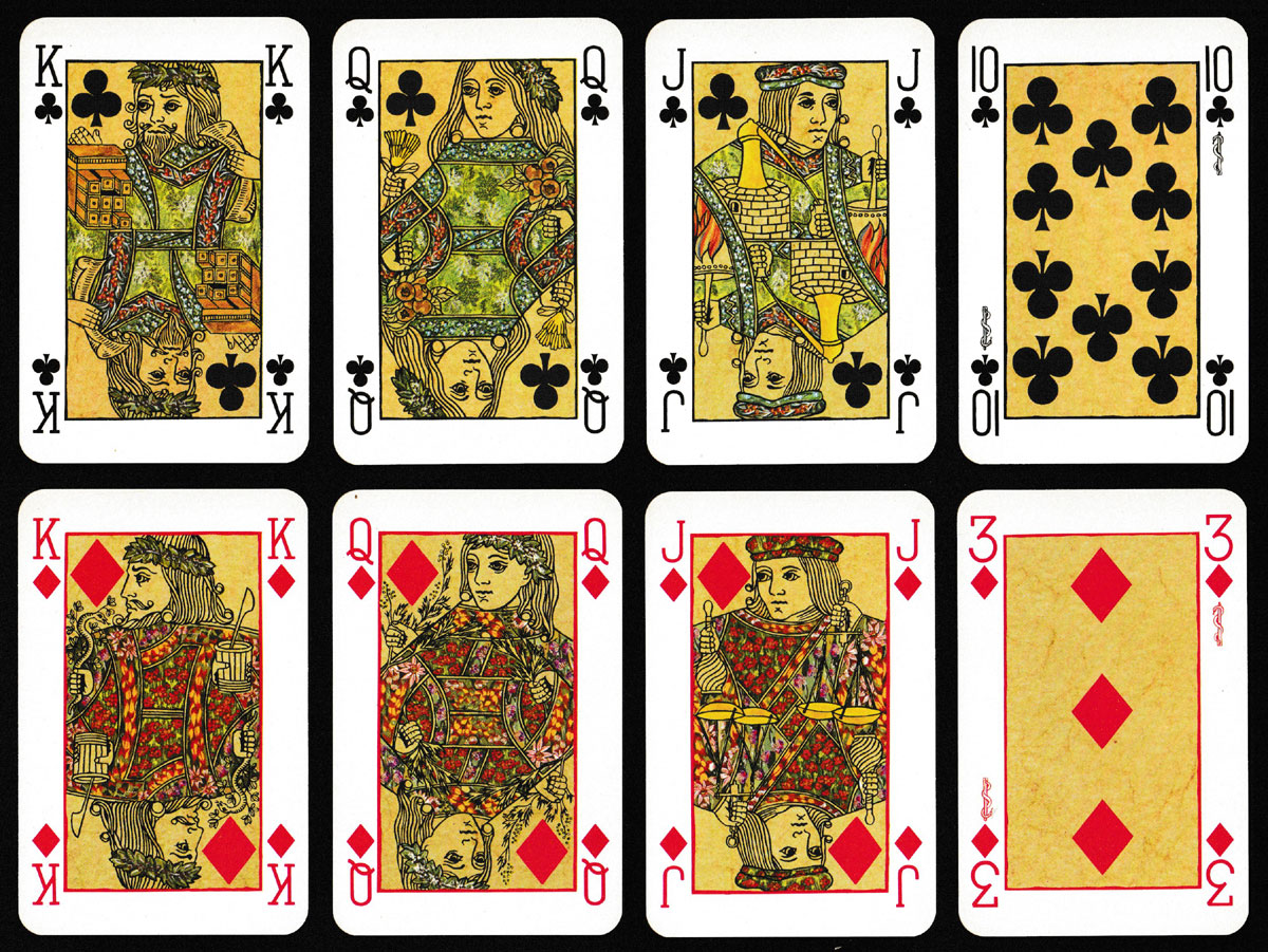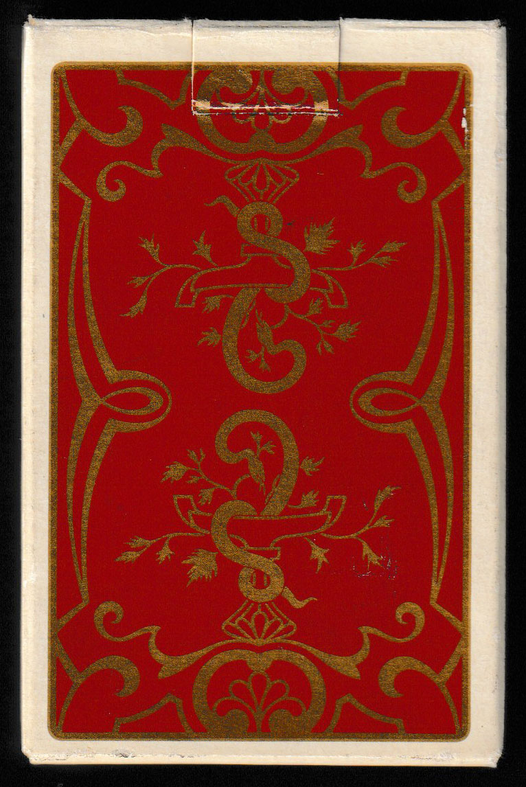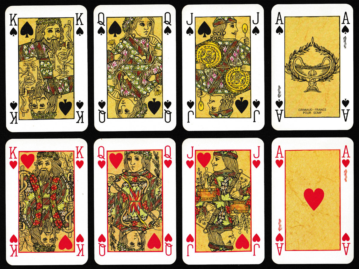 SEMP stands for the Société d’Editions Médico-Pharmaceutiques (a French medical and pharmaceutical publishing company). In this promotional pack, the Anglo-American courts have been modified in several respects: their crowns have been replaced by wreaths, their hair has become more straggly, and they sport floral clothing. In addition, they have been given attributes associated with medicine and pharmaceutics – mortars, pestles, scales, medicinal plants, the Rod of Asclepius (KH and down each side of the numeral cards), etc. The maker’s name and “POUR SEMP” appear on the Ace of Spades. The cards have gilt corners. See the box►