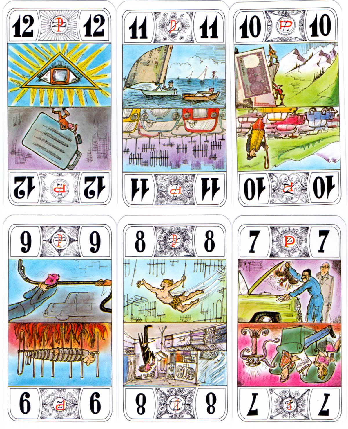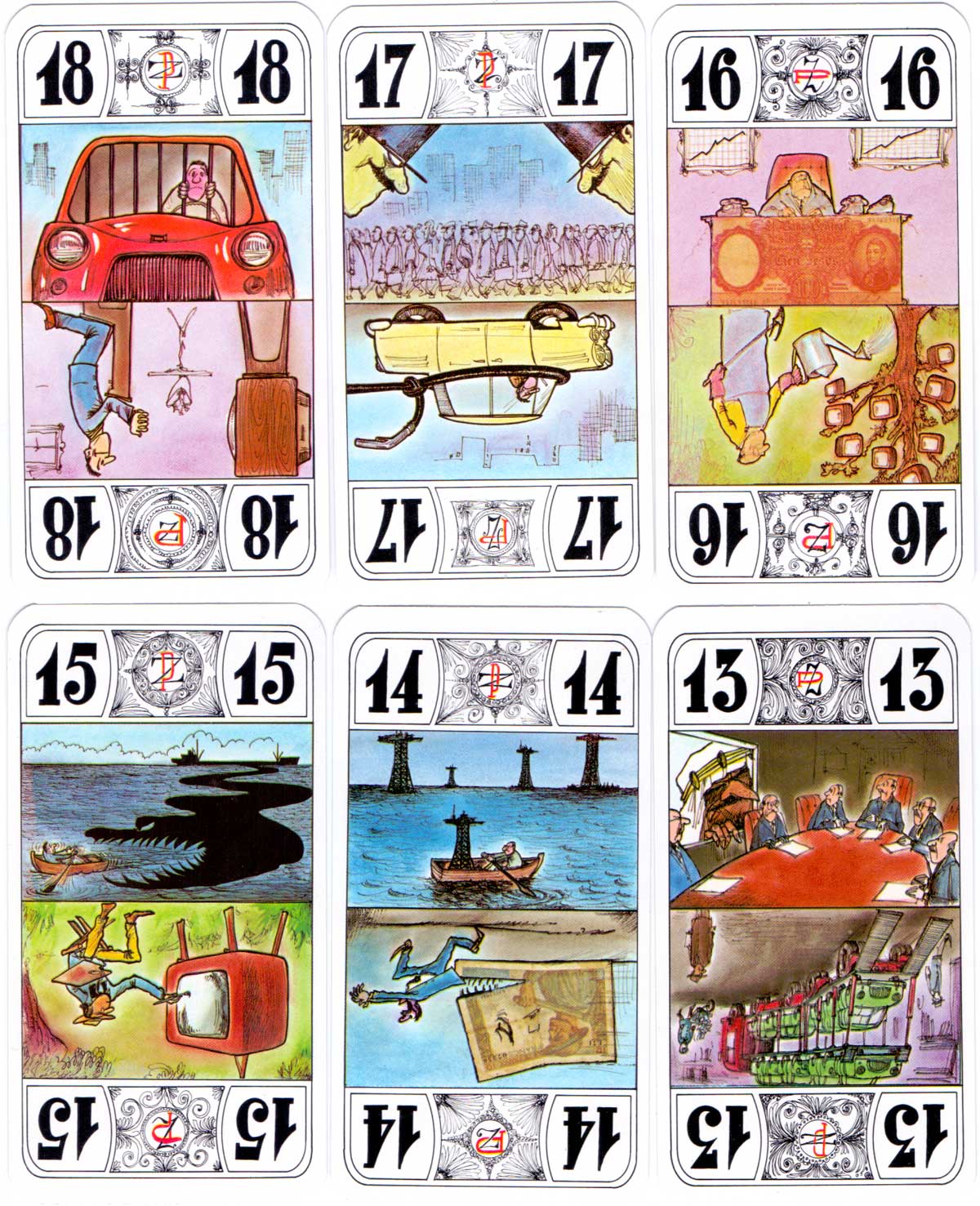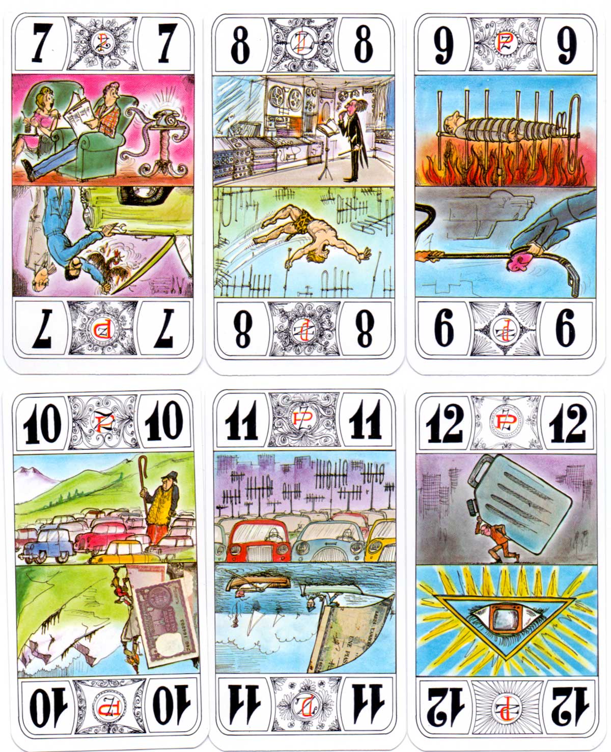 “Tarot de l’An 2000” designed by Pino Zac (Giuseppe Zaccaria born in Italy 1930 – died 1985), published by France Cartes in 1981. The double-ended trump cards feature different ironic cartoons at each end, expressing the artist’s dismay and disillusionment with end-of-20th century life, the motor car, petroleum industry, electronics and the Freudian collective unconscious. The Trumps are numbered 1-21, but their titles are left to players’ imagination. The minor cards (pip cards) are transformed with more spicy sketches.