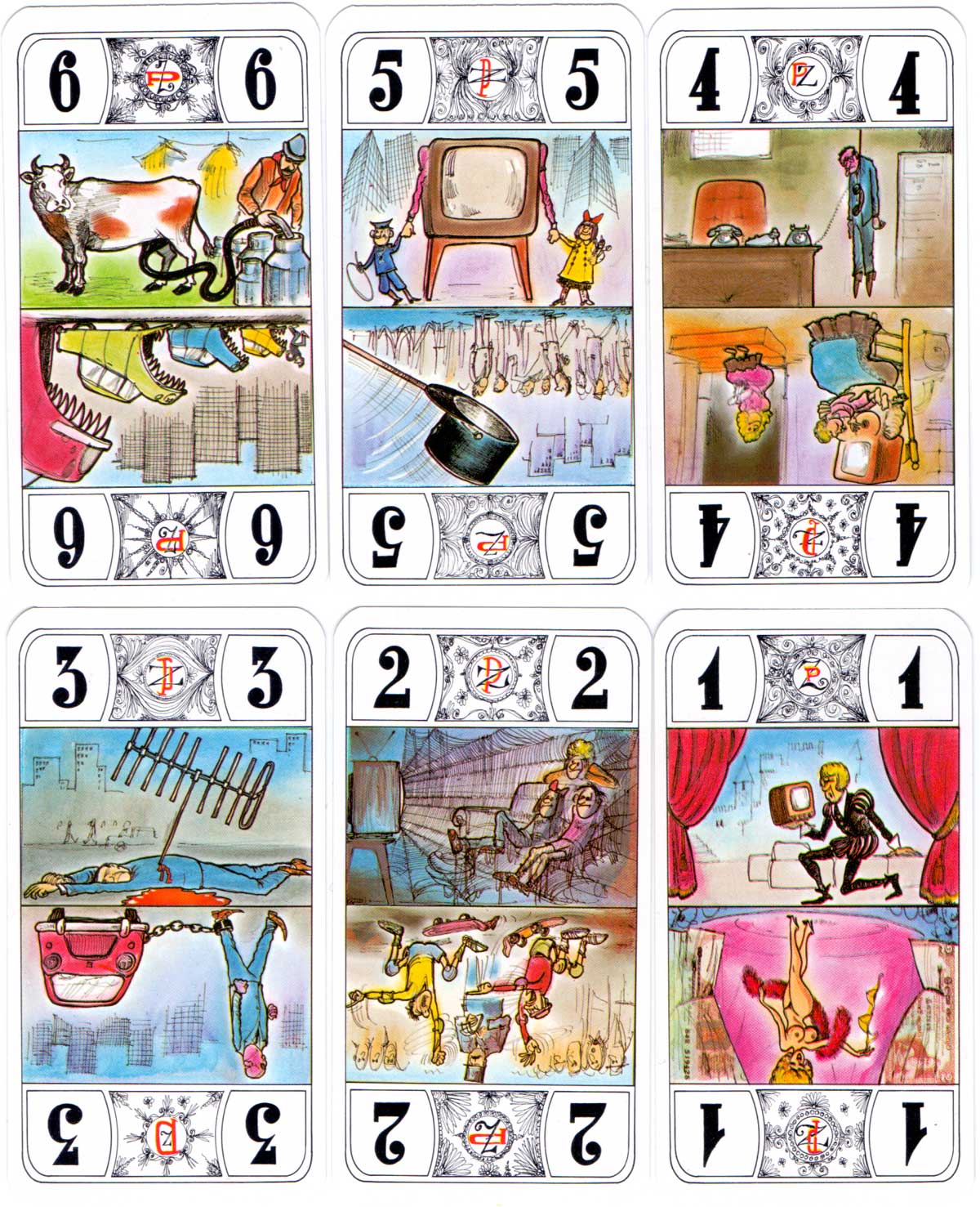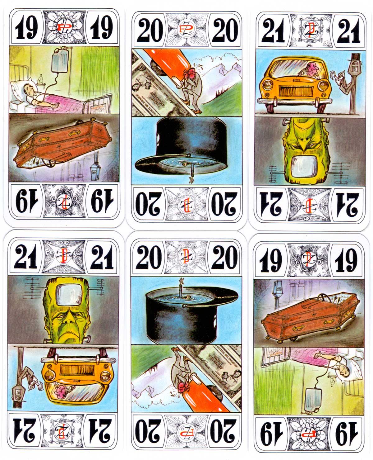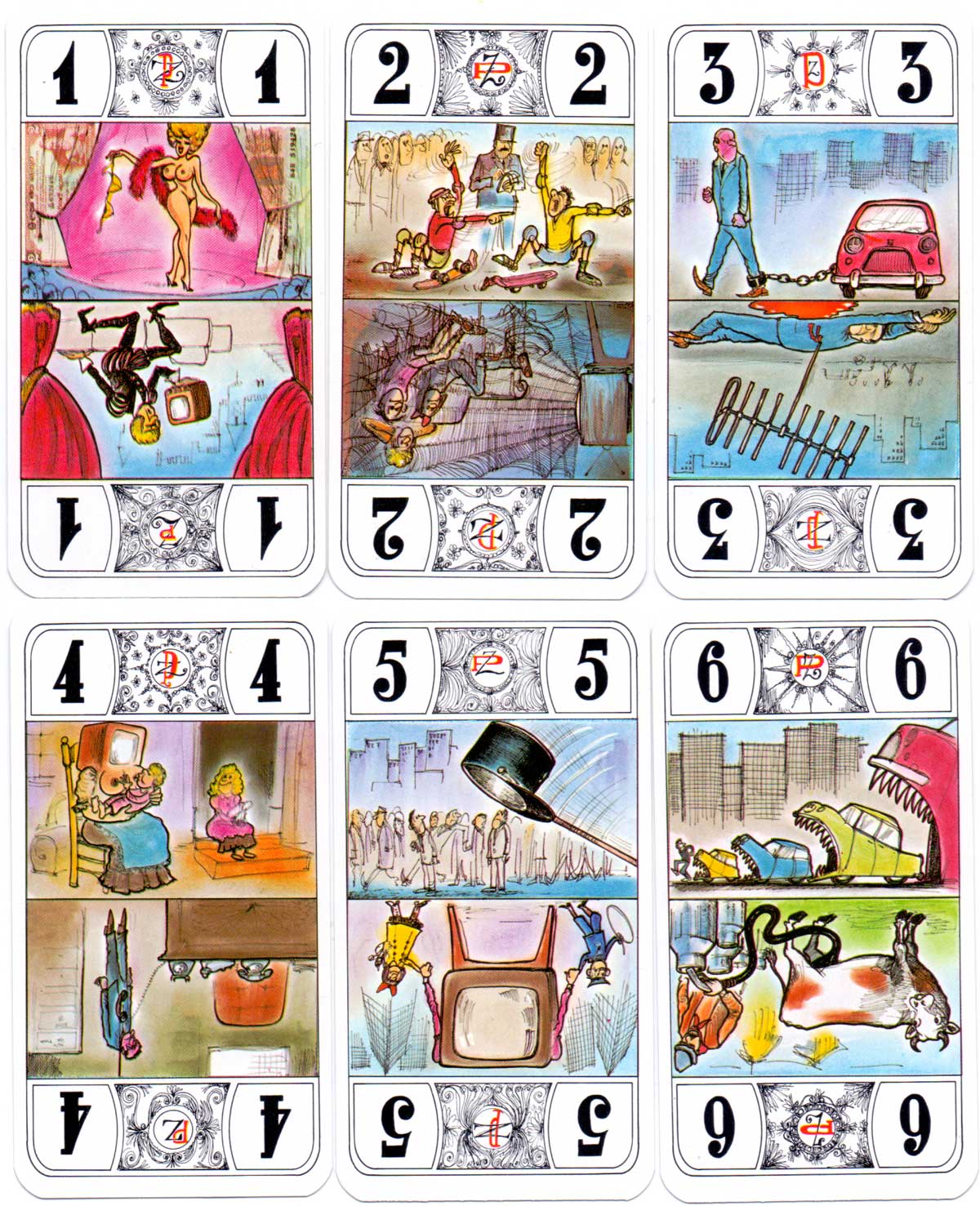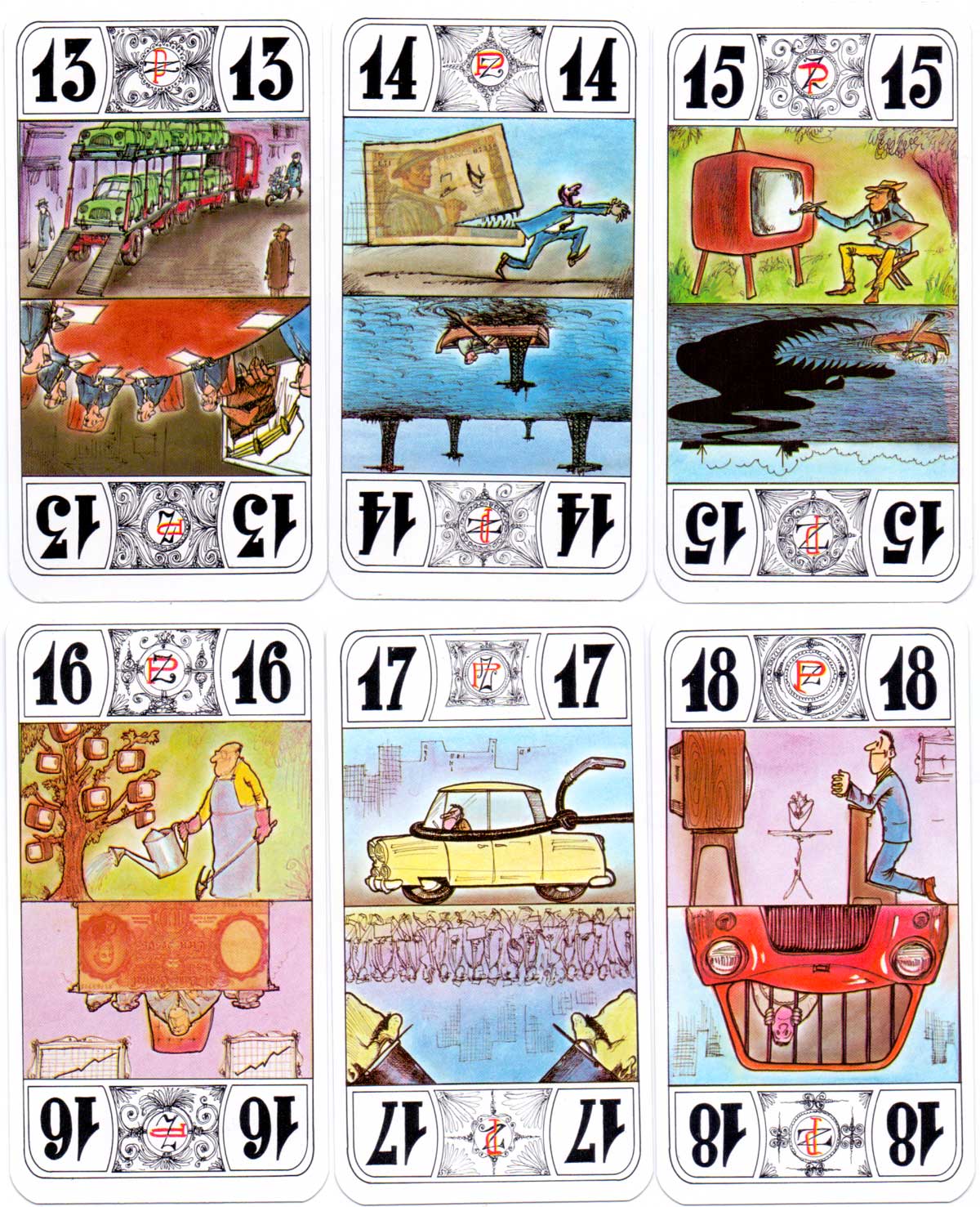 “Tarot de l’An 2000” designed by Pino Zac (Giuseppe Zaccaria born in Italy 1930 – died 1985), published by France Cartes in 1981. The double-ended trump cards feature different ironic cartoons at each end, expressing the artist’s dismay and disillusionment with end-of-20th century life, the motor car, petroleum industry, electronics and the Freudian collective unconscious. The Trumps are numbered 1-21, but their titles are left to players’ imagination. The minor cards (pip cards) are transformed with more spicy sketches.