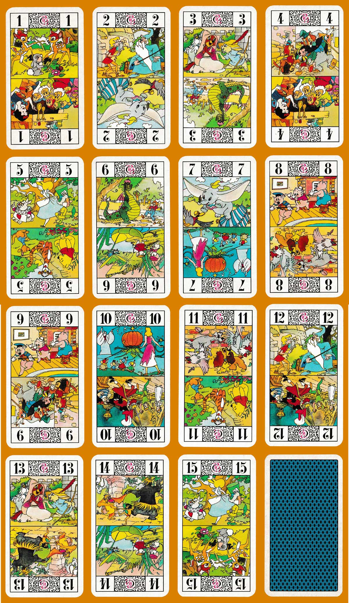 Introducing children to card games can take many forms. Usually, children start by playing simple games like Snap. The French Jeu de Tarot is far from simple, involving, as it does, 78 cards. Reducing the number of cards to 55, reducing the size of the cards, simplifying the rules and employing Disney characters (as here) were all part of a short-lived attempt to get children to play Tarot. The court cards depict Mickey, Minnie, Pluto and Donald Duck. Cards Ace to 4 have been axed, while the number of trump cards has been reduced from 22 to 15. There is repetition amongst the images on the trump cards – surely Disney could have supplied 30 different ones?! For Disney collectors this may be a pack that they have overlooked – it is not so easy to find 40 years on. See the box►